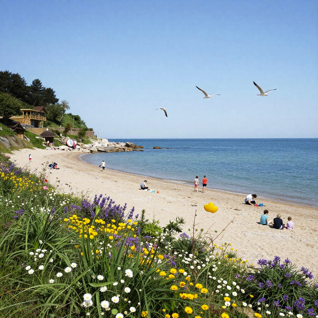Spring beach pictures with vibrant wildflowers along the coastline, bright blue waters under clear skies, families enjoying the warm sunshine, and seagulls soaring above