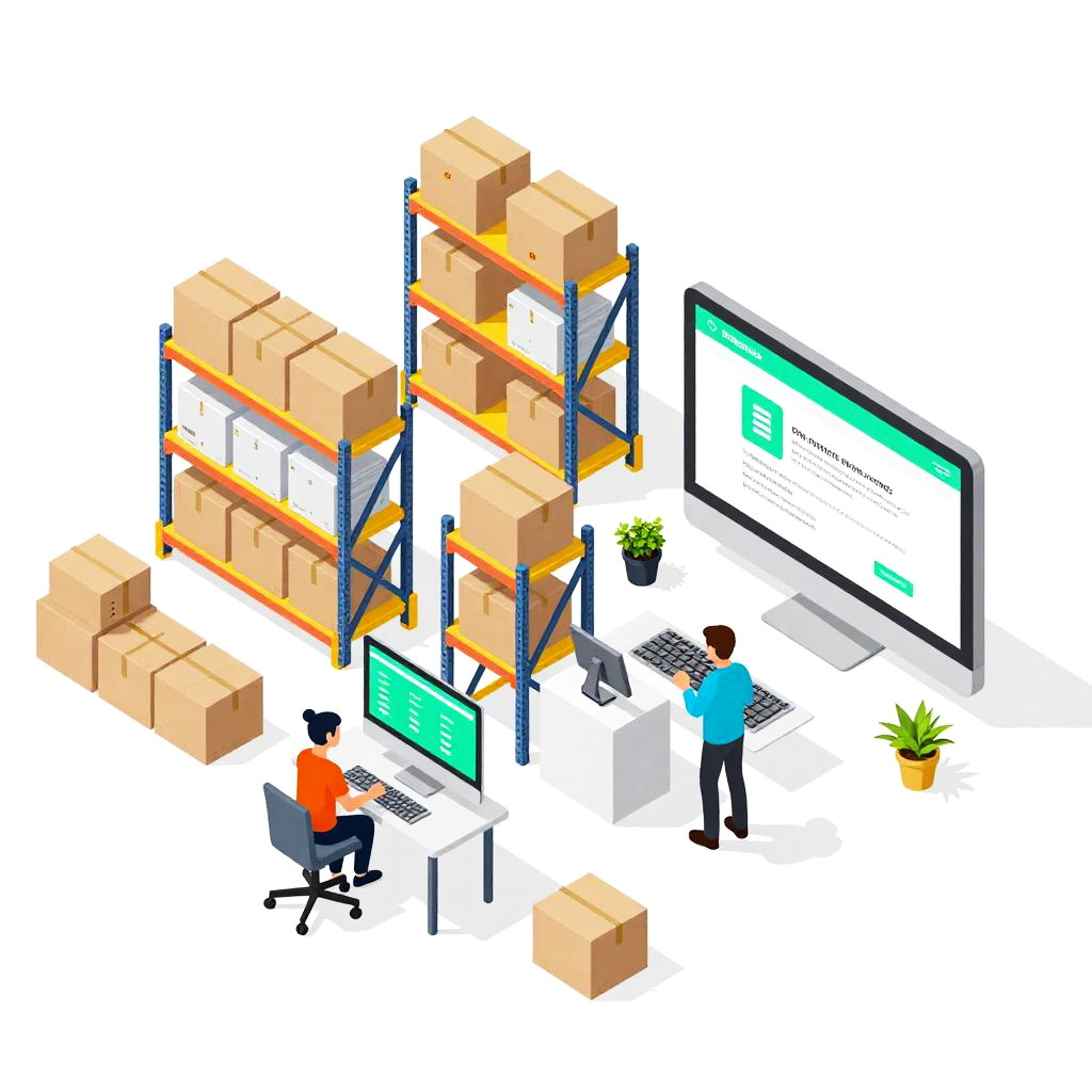 Online isometric drawing of a bustling e-commerce platform warehouse, dynamic composition, bright and vivid colors, detailed machinery