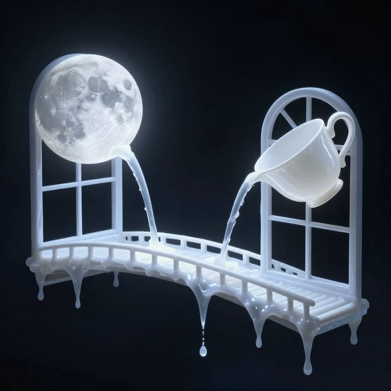 Digital art: Glowing white metal bridge with a pouring teacup against a bright full moon on a black background. Liquid drips from bridge edges