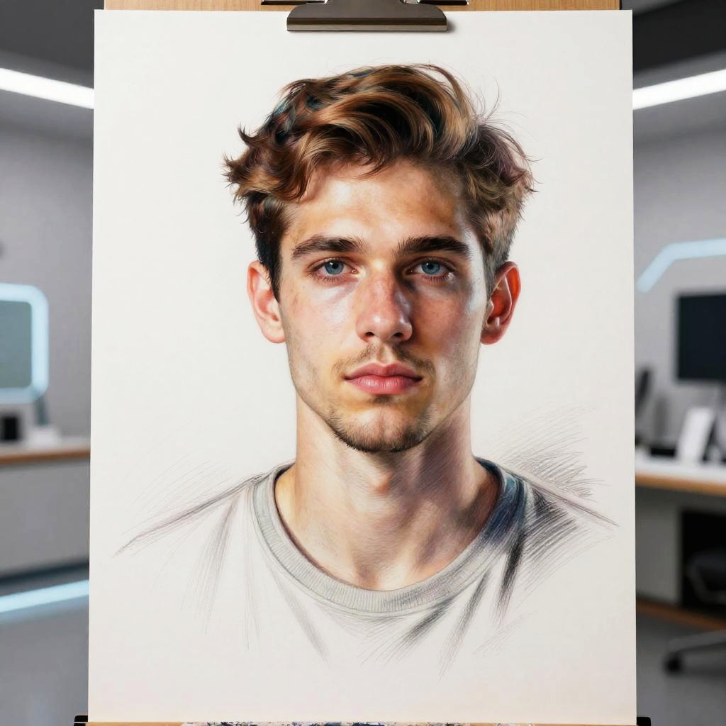 Img2img AI generator transforming a hand-drawn sketch into a realistic portrait, vibrant colors, smooth textures, ultra-detailed, futuristic art studio background, soft lighting, digital brushes effect, high resolution