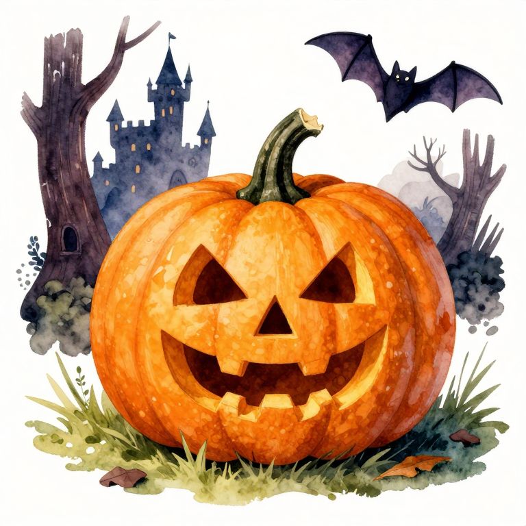 A vibrant, watercolor illustration of a carved pumpkin in a spooky, forested scene with a white background, featuring a castle in the distance and a bat flying overhead.