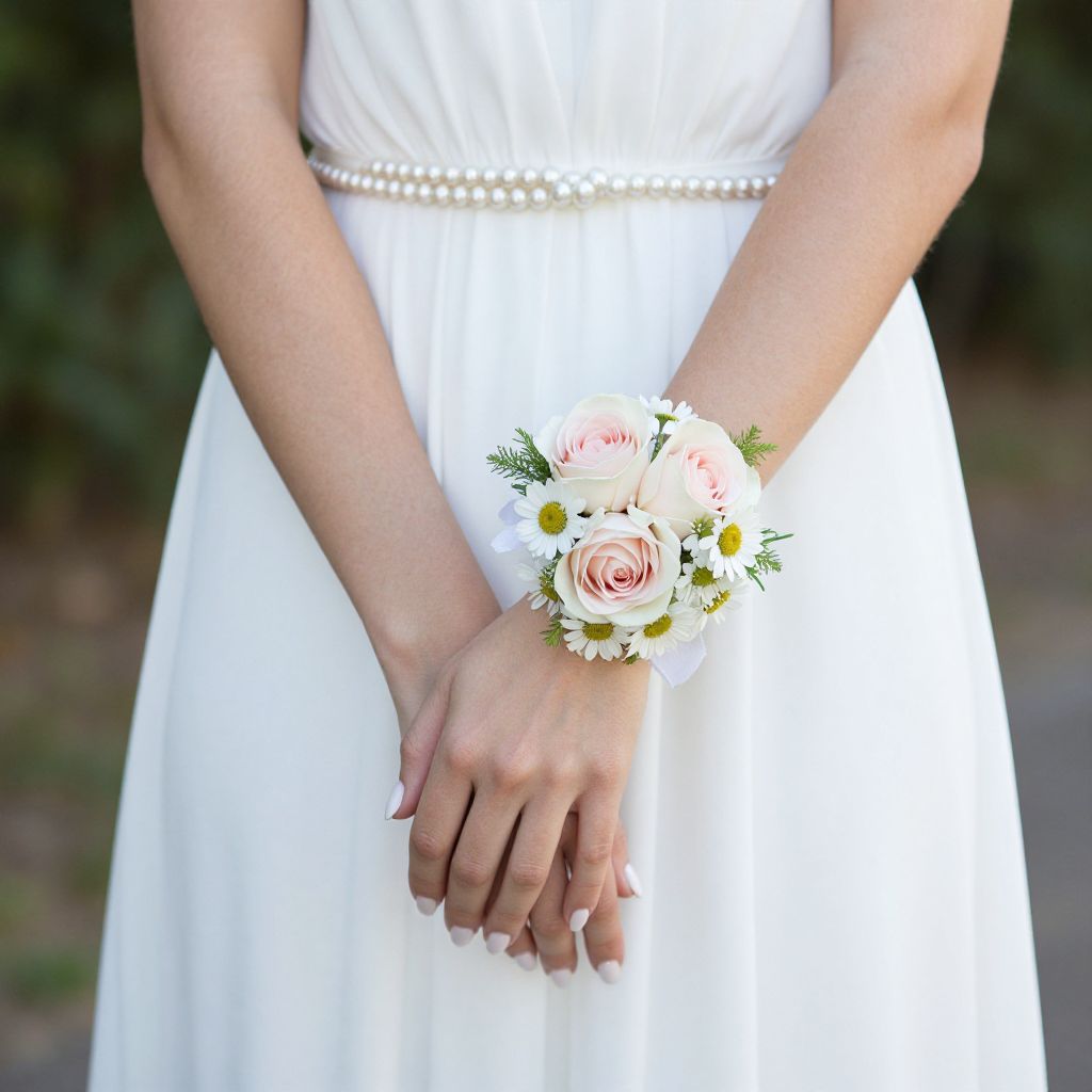 Elegant wrist corsages featuring delicate pink roses, white daisies, and green foliage adorn the arms of a bride in a flowing white dress, complemented by a pearl belt and matching manicure.