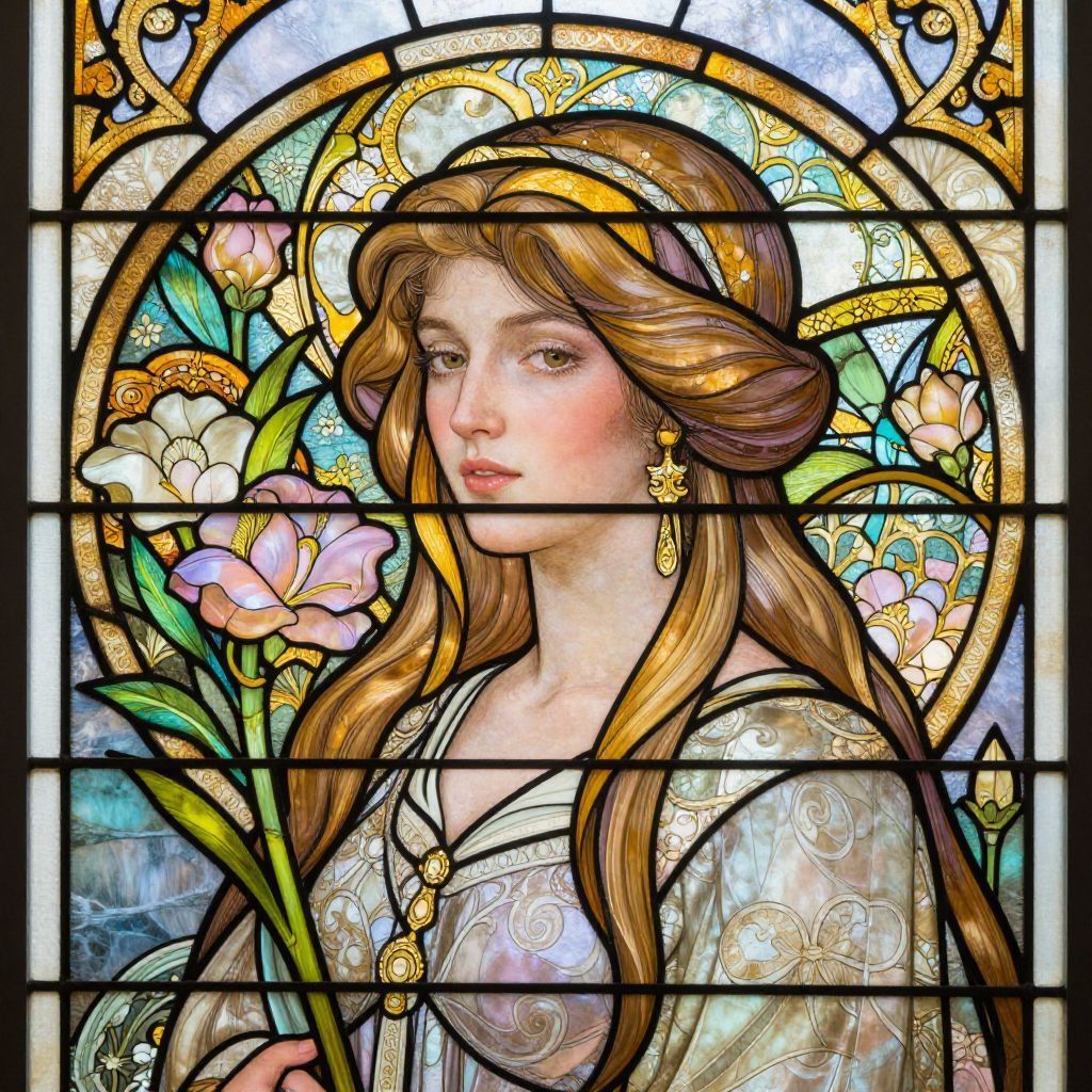 Stained glass art style portrait of a serene woman surrounded by floral motifs, soft pastel colors blended with vivid greens and yellows, detailed filigree lead lines, inspired by Art Nouveau cathedral windows, ethereal light reflection, handcrafted appearance with polished finish