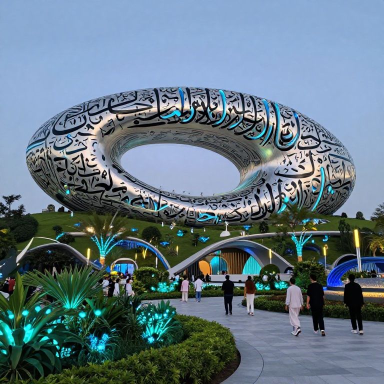 Photograph of a modern outdoor scene at dusk featuring a large, circular, silver metallic sculpture adorned with intricate Arabic calligraphy in black. The sculpture is elevated and prominently displayed against a clear, light blue sky. Below, a paved pathway is lined with glowing blue plants and manicured greenery. Several people, dressed in a mix of traditional and modern attire, walk along the path. In the background, there are additional architectural elements with curved, blue-lit roofs and lush greenery. The overall ambiance is futuristic and serene.