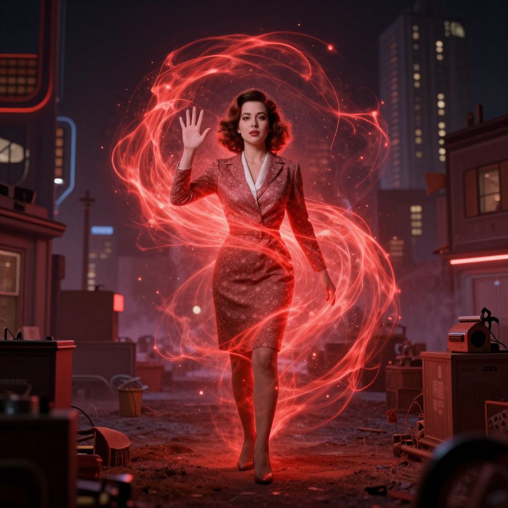 Wandavision inspired surreal cityscape blending 1950s retro sitcom aesthetics with magical red energy swirling around a mysterious woman in vintage clothing, dreamy and eerie atmosphere, digital art style