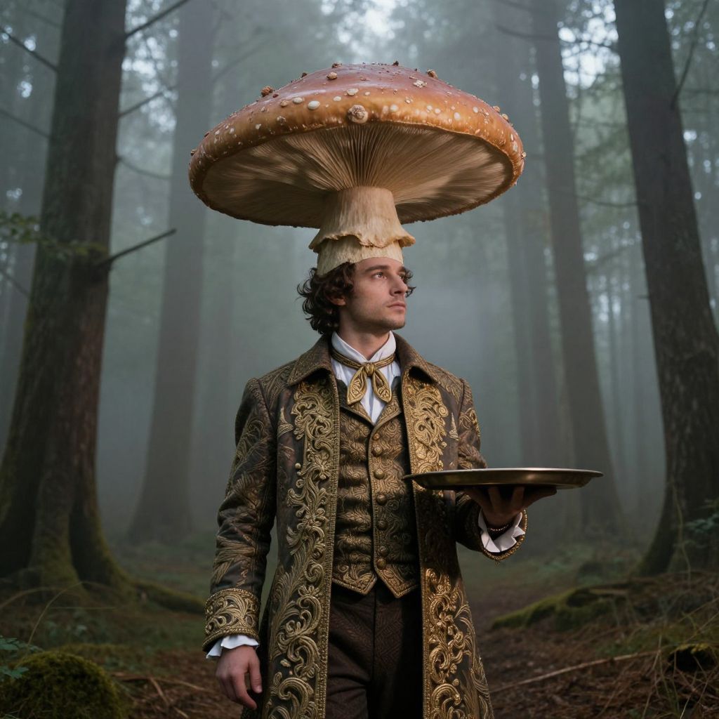 In this highly detailed and photorealistic image, a man dressed in a vintage, ornate coat with intricate gold embroidery stands in a misty forest. His attire is complemented by a large, textured mushroom perched atop his head, creating a surreal and whimsical scene. The man holds a tray in his hands, adding to the enigmatic atmosphere. The background features tall, slender trees shrouded in fog, enhancing the mystical ambiance. The lighting is cinematic, with soft, diffused light that highlights the textures and details of the man's coat and the mushroom, creating a visually striking and imaginative composition.