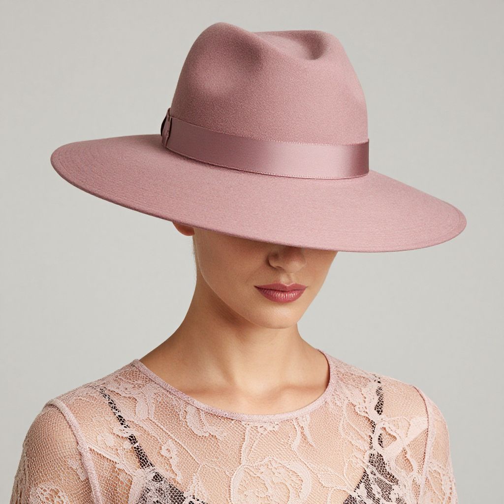 Elegant woman wearing a wide-brimmed mauve pink fedora adorned with a satin band, paired with a delicate lace top, exudes a chic and sophisticated style against a neutral backdrop.