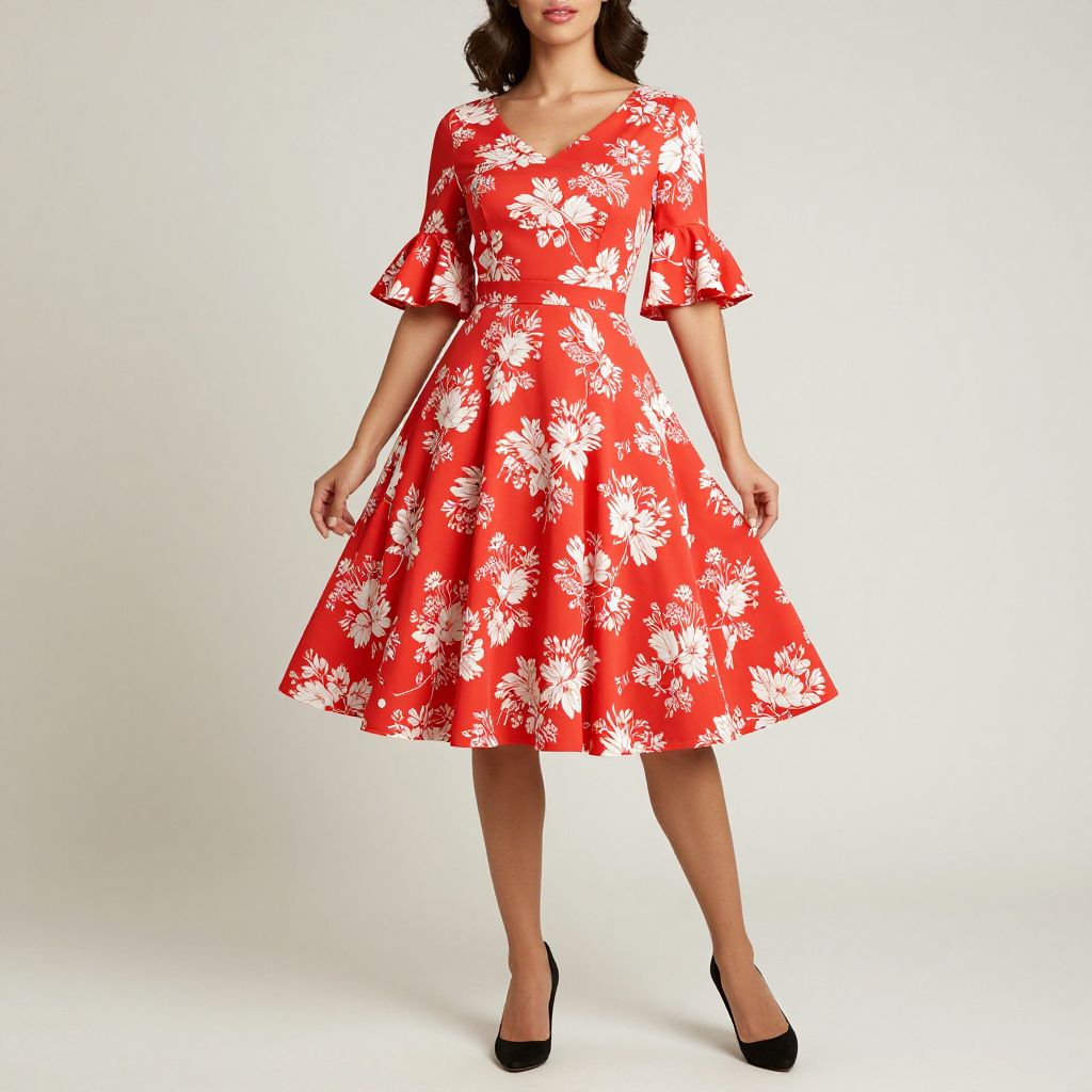 A woman elegantly poses in a vibrant 1950s-inspired floral flare sleeve swing dress, featuring bold red tones and delicate white floral patterns, complemented by black high heels and a retro aesthetic captured in high-definition detail against a clean, minimalist backdrop.