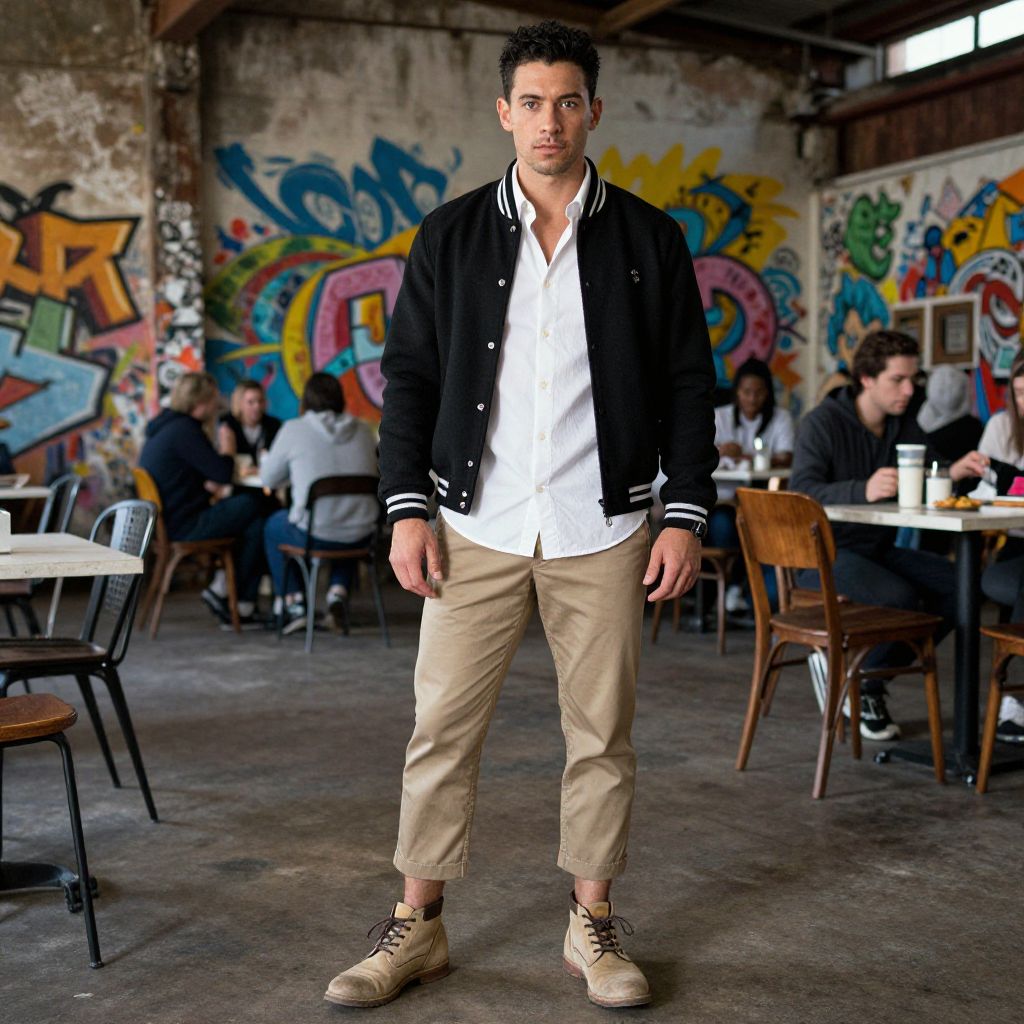 A man, black urban explorer varsity jacket, fitted white button-up shirt, cropped khaki chinos, stylish desert boots, rustic warehouses, colorful street art, bustling cafes, ektachrome film stock, confident expression, vibrant energy. Man has masculine face and piercing eyes