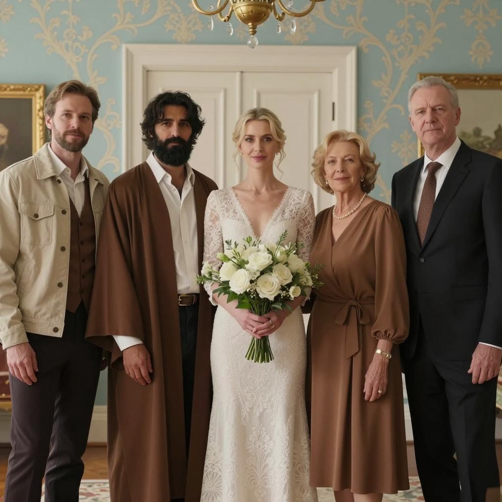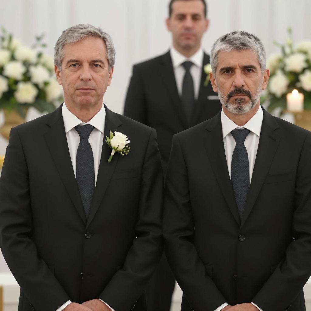 Photograph of two middle-aged men in formal black suits with white shirts and ties, standing side by side. The man on the left has gray hair, a white rose boutonnière, and a neutral expression. The man on the right has gray hair, a short beard, and a serious expression. A third man in a black suit stands in the background. Blurred floral arrangement and candle in the background.