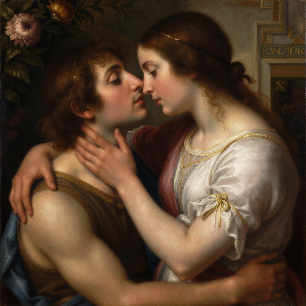 Lovers embrace painting in renaissance style, rich warm tones, intricate brushstrokes, soft romantic lighting, tender emotional connection, detailed background with vintage floral elements