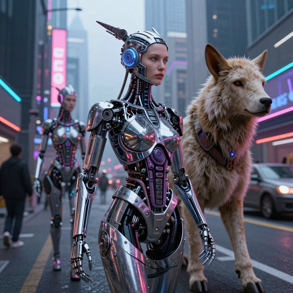 Photorealistic CGI of a futuristic city street with a silver, robotic woman and a large, realistic wolf walking beside neon-lit buildings.