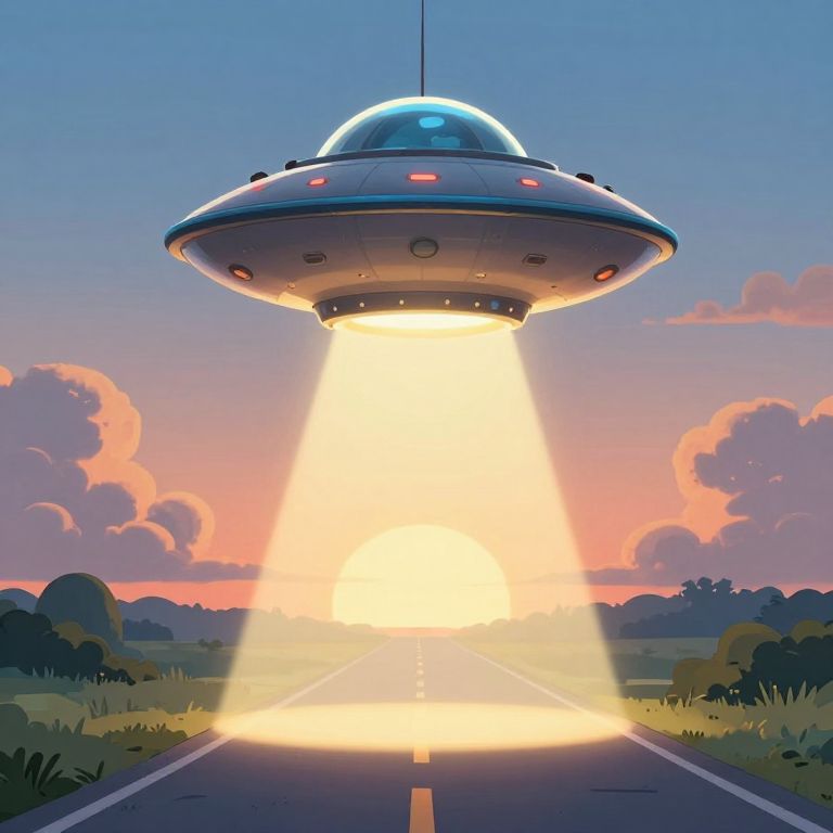A cartoon-style UFO hovers above a road, casting a beam of light, with a symmetrical exposure and a backdrop of clouds and a setting sun.