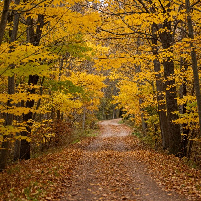 Photograph of a forest path during autumn. The narrow dirt trail is lined with tall trees, their branches adorned with vibrant yellow leaves. The ground is covered in a carpet of fallen brown and orange leaves. The trees, with dark brown and grey trunks, form a natural canopy overhead. The background reveals a continuation of the forest, with more trees and a slightly blurred path, creating a sense of depth. The image captures the warm, golden hues of the season, evoking a serene and picturesque autumnal atmosphere.