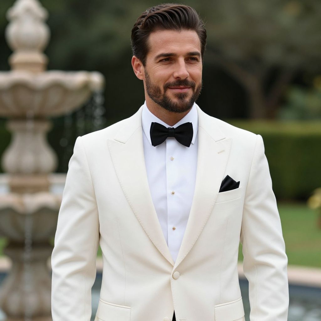 Photograph of a handsome man standing outdoors in a garden. He has dark brown, neatly styled hair and a trimmed beard. He's wearing a white tuxedo jacket with a black bow tie, white dress shirt, and a black pocket square. He's smiling slightly, looking confident. The background is blurred with greenery and a stone fountain visible. The lighting is natural, highlighting his formal attire.