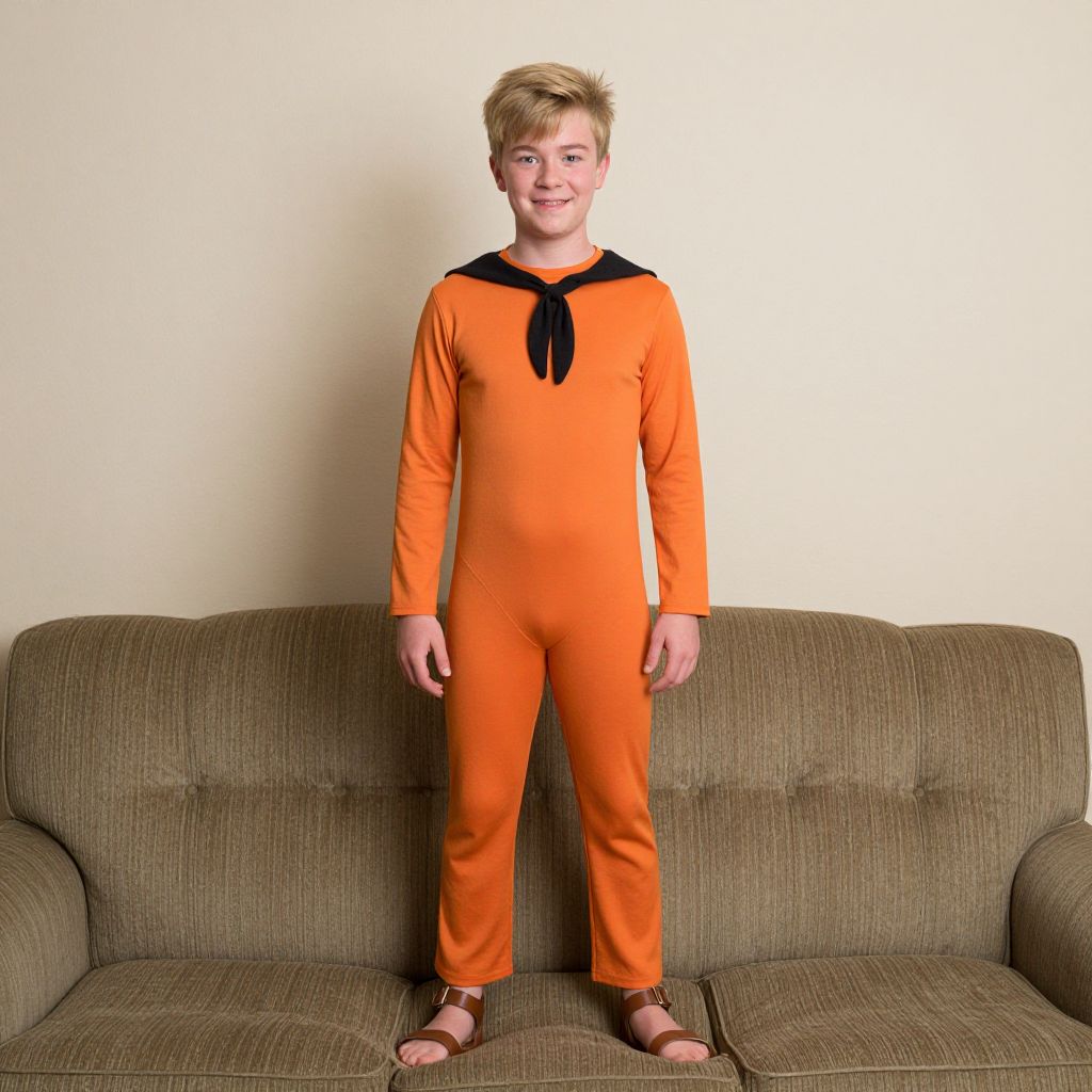 Fred flintstone costume, 1boy, male focus, solo, blonde hair, standing, couch, full body, sandals, looking at viewer, smile