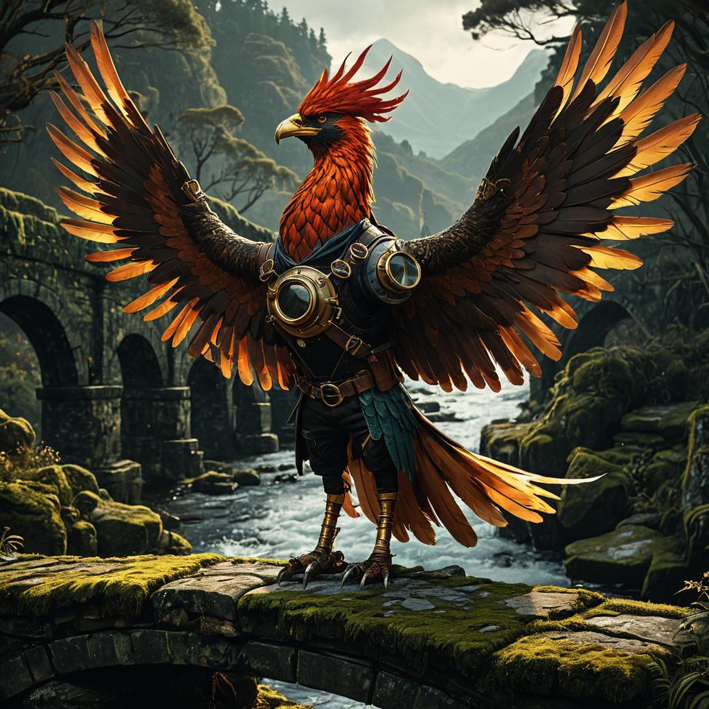 Majestic Anthropomorphic Phoenix on Mossy Stone Bridge