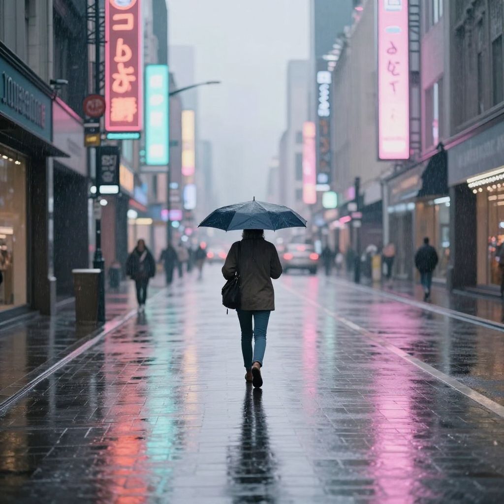 Lofi style rainy city street scene, neon signs reflecting on wet pavement, a lone figure with umbrella walking, pastel tones, soft focus, atmospheric and moody ambiance