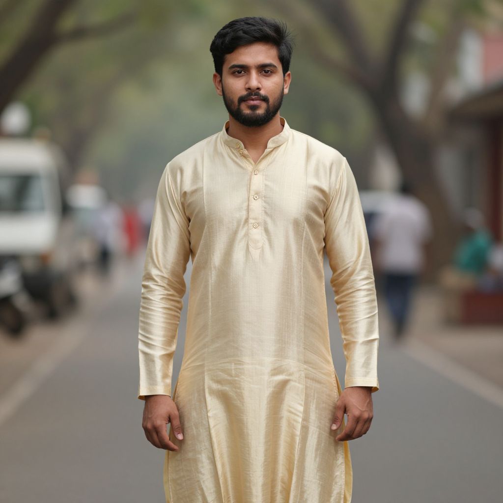 Photograph of a bearded South Asian man with dark hair, wearing a shiny gold traditional long kurta, standing confidently on a blurred urban street with
