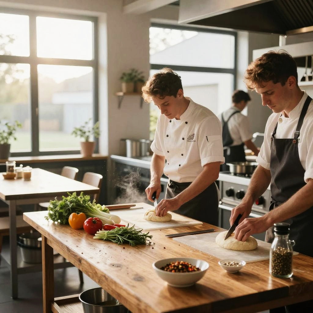 Restaurantkeuken captured in early morning prep, chefs chopping vegetables and kneading dough, soft natural light flooding large windows, rustic wooden tables mixed with modern kitchen equipment, aroma of fresh herbs and spices filling the air, calm before the dinner storm