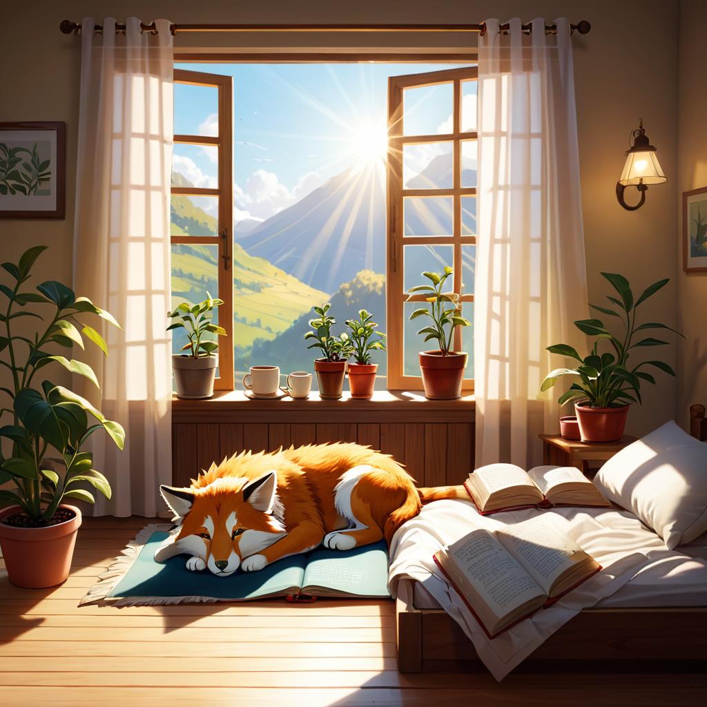 A warm, sunlit bedroom features a sleeping fox curled up on a blanket next to a bed with open books. The room has wooden floors, a bedside table with potted plants, sheer white curtains framing an open window, and mountain scenery visible outside. Soft sunlight filters through, casting shadows and highlighting the tranquil atmosphere.