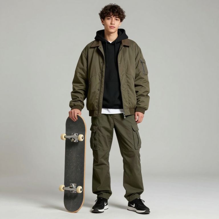 Casual young individual standing confidently while holding a skateboard upright between their legs, dressed in a layered outfit featuring a dark olive jacket over a black hoodie, paired with cargo pants and black sneakers, set against a neutral background.
