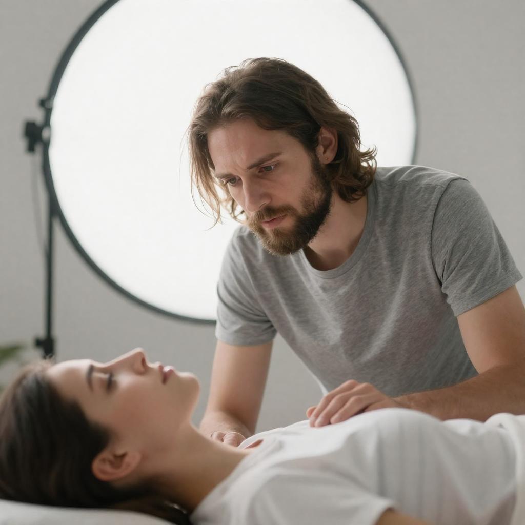 Photograph of a man with long brown hair and a beard, wearing a gray t-shirt, leaning over a person lying on a white bed. The background features a large, bright circular light. The man's expression is focused and concerned. The person on the bed is partially visible, wearing a white striped shirt.