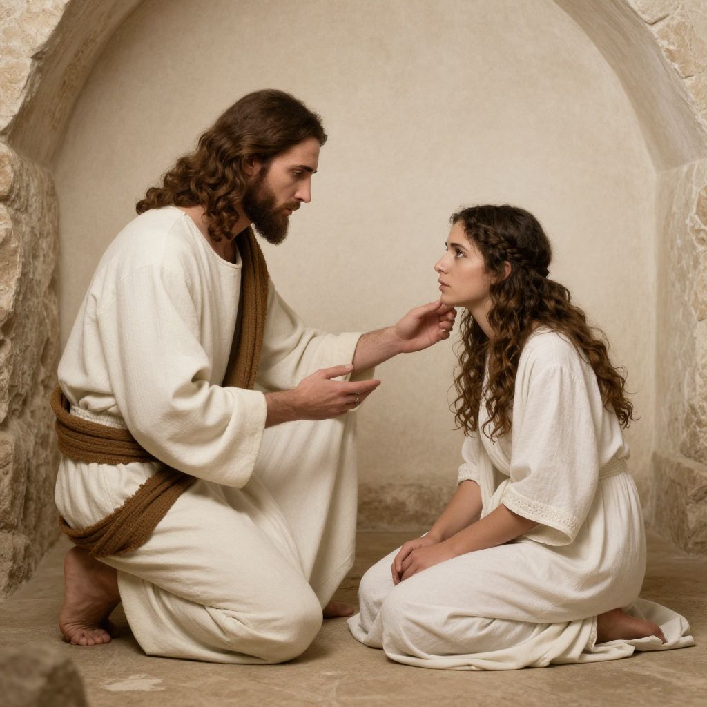 Photograph of a biblical scene featuring a bearded man with long, dark brown hair kneeling in a white robe and brown sash, hands clasped in prayer. A woman with long, wavy brown hair, wearing a sleeveless brown dress, kneels before him, hands raised in supplication, touching his chin gently with her right hand. They are on a tiled floor with a beige, arched wall background. The man's expression is solemn, while the woman's gaze is upward, focused on him. The image has a soft, natural light, enhancing the serene and reverent atmosphere.