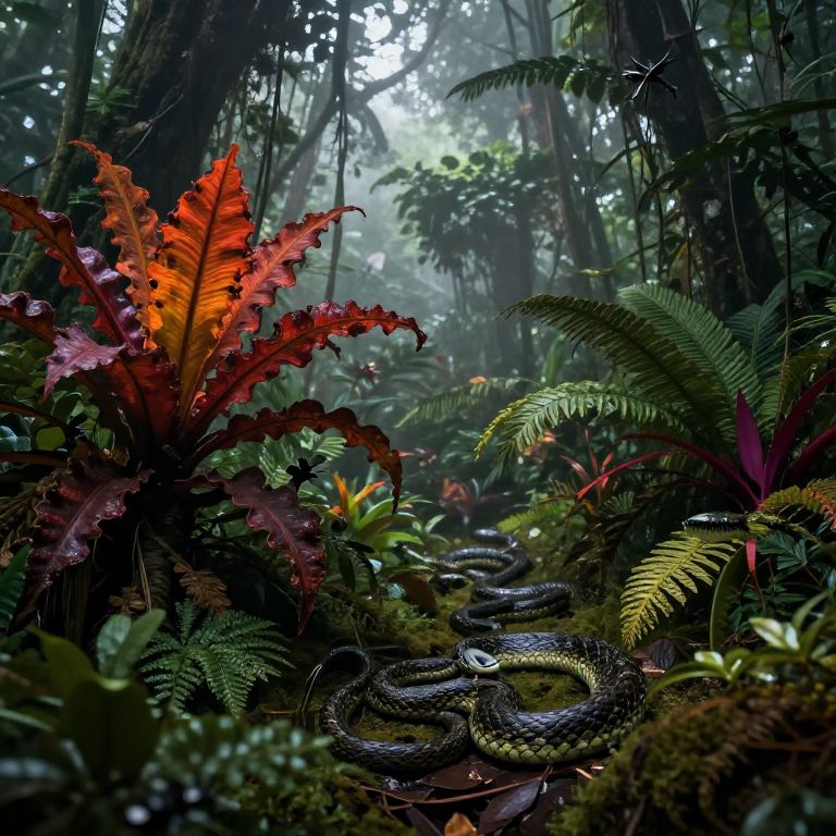 Photorealistic digital artwork of a dense, misty jungle with vibrant red and green ferns, a coiled snake on mossy ground, and