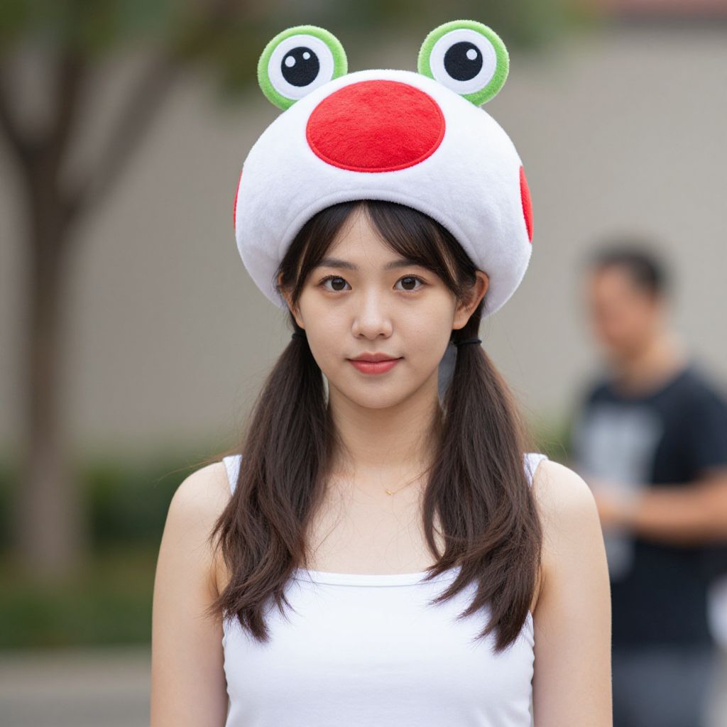 Photograph of an Asian woman with light skin and long, dark brown hair in pigtails, wearing a white, sleeveless dress and a whimsical hat resembling a mushroom with a red nose, green eyes, and white cap. The background is slightly blurred, featuring a man in a black shirt and greenery. The woman's expression is neutral, and the image has a soft focus, emphasizing the hat's playful design. The setting appears to be an outdoor urban area.