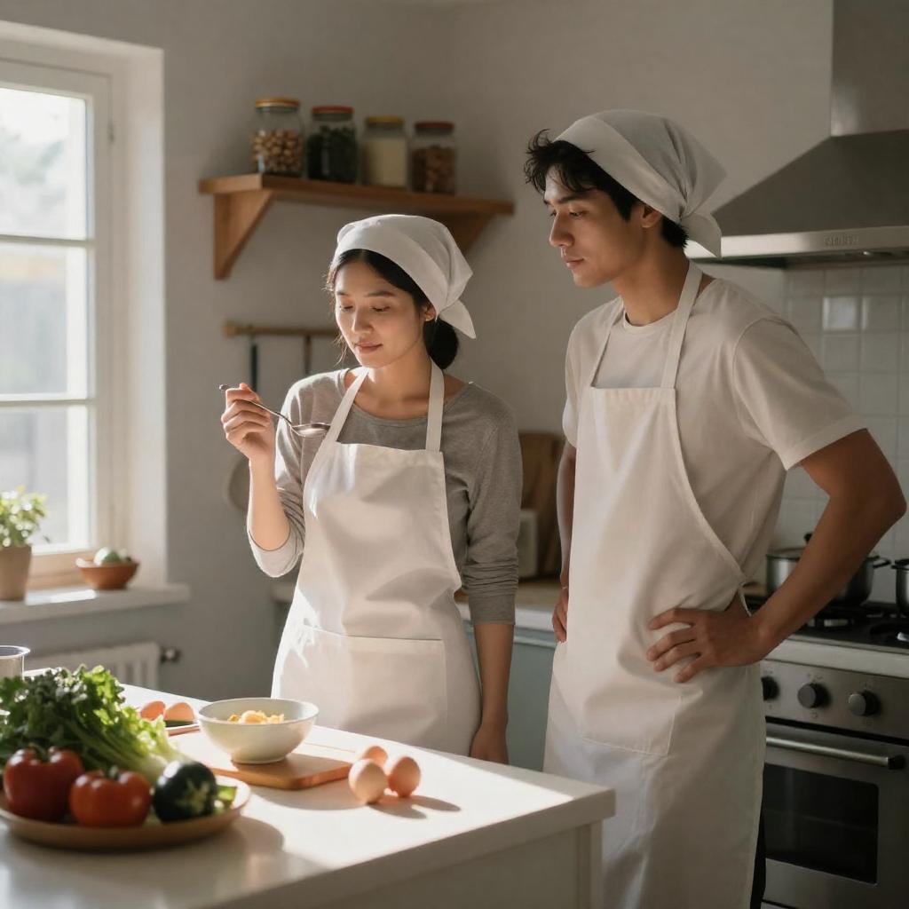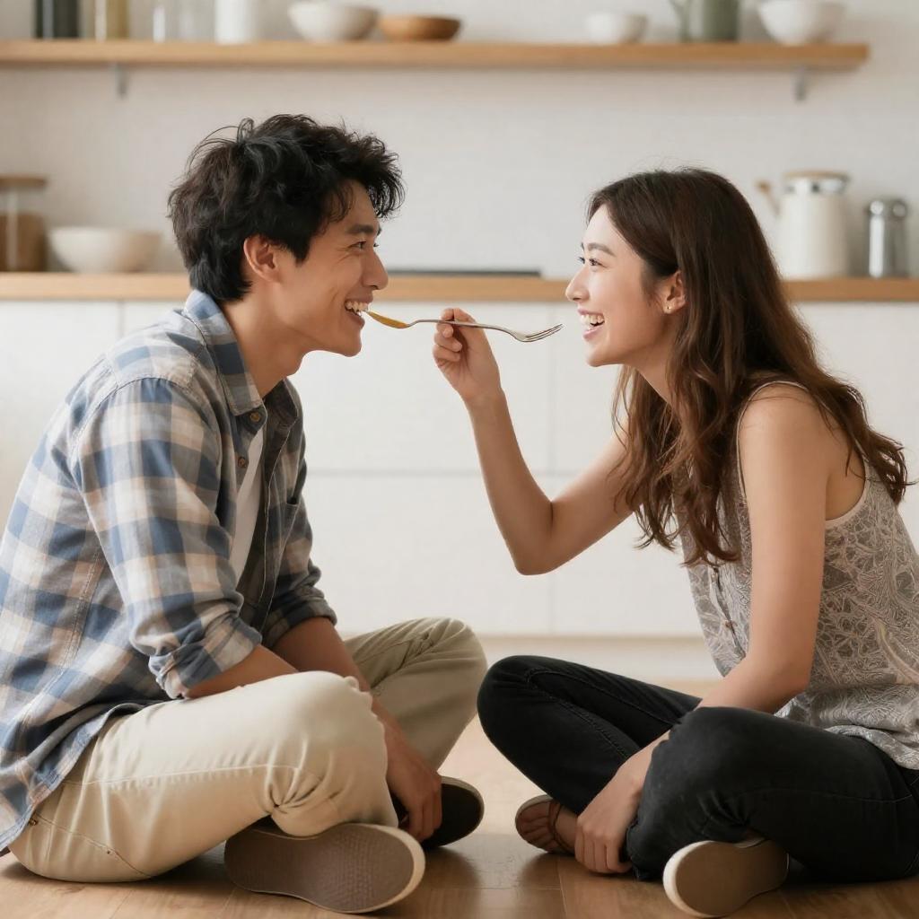 Photograph of a man and woman sitting on the floor facing each other. Man with short black hair, plaid shirt, and beige pants, smiling. Woman with long brown hair, sleeveless patterned top, and black pants, feeding him from a fork. Brightly lit kitchen background with shelves and bowls. Both smiling, intense expressions.