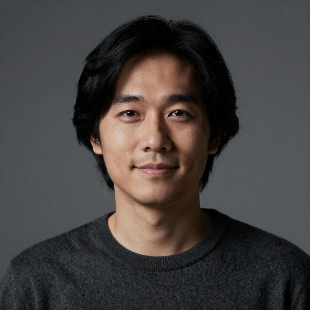 East Asian man with short black hair, wearing dark clothing and a green scarf, looking upward into autumn forest. Leaves in foreground, tree trunk on right, blurry background. Serious expression. Mid-shot.