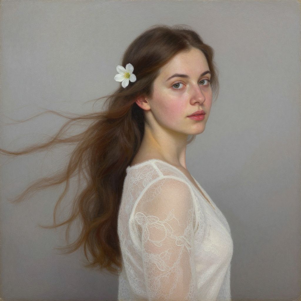 Portrait of a woman with flowing brown hair adorned with a delicate white flower, wearing a sheer white lace top, captured by Emilii Wilk, a Polish figurative painter born in 1983.