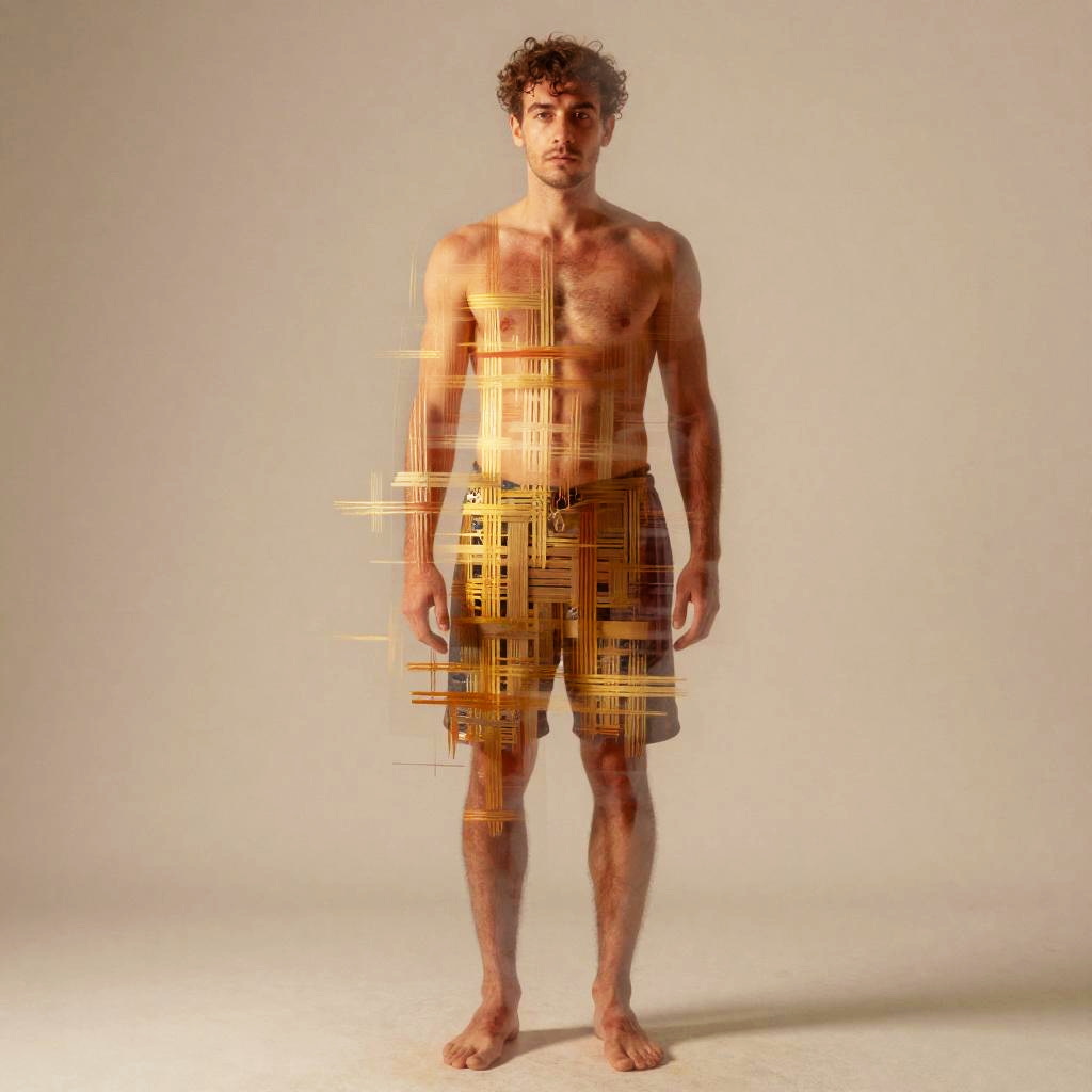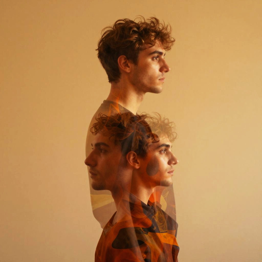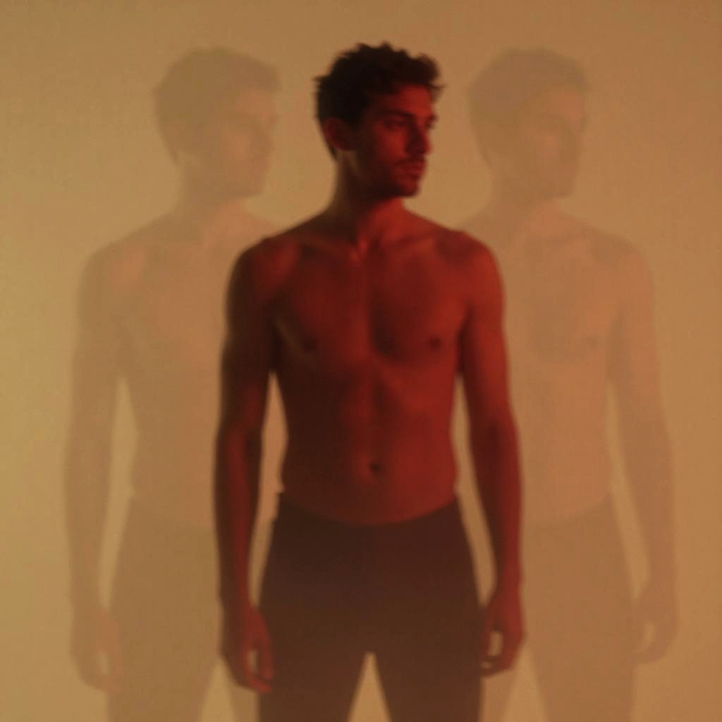 Male form, impressionistic blur effect, earthy warm colors, burnt orange and sienna dominant tones, modern surrealism style, contemporary blend exposures, ghost trails, mirrored visuals