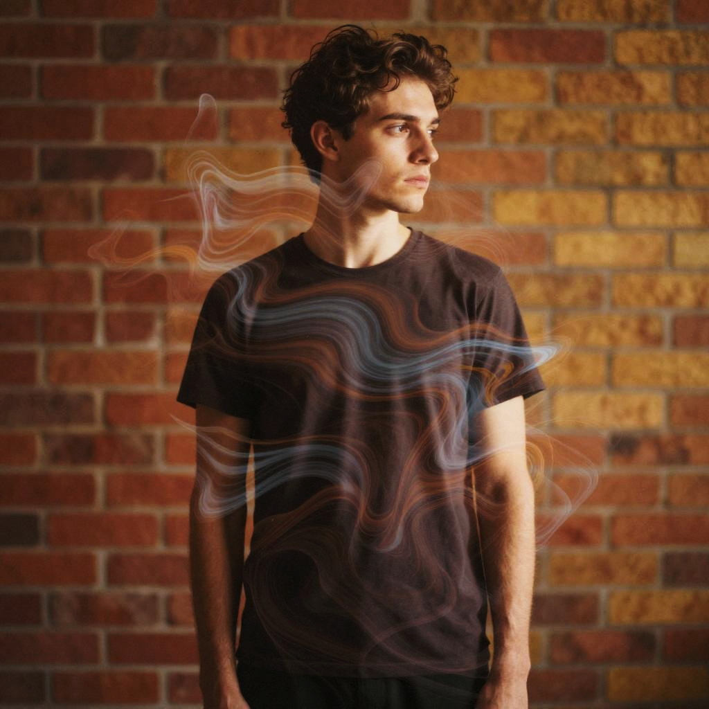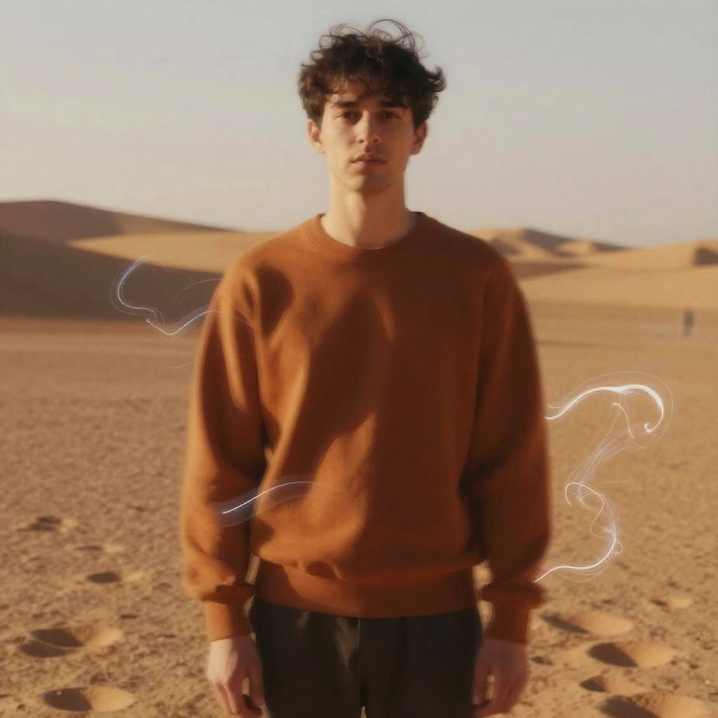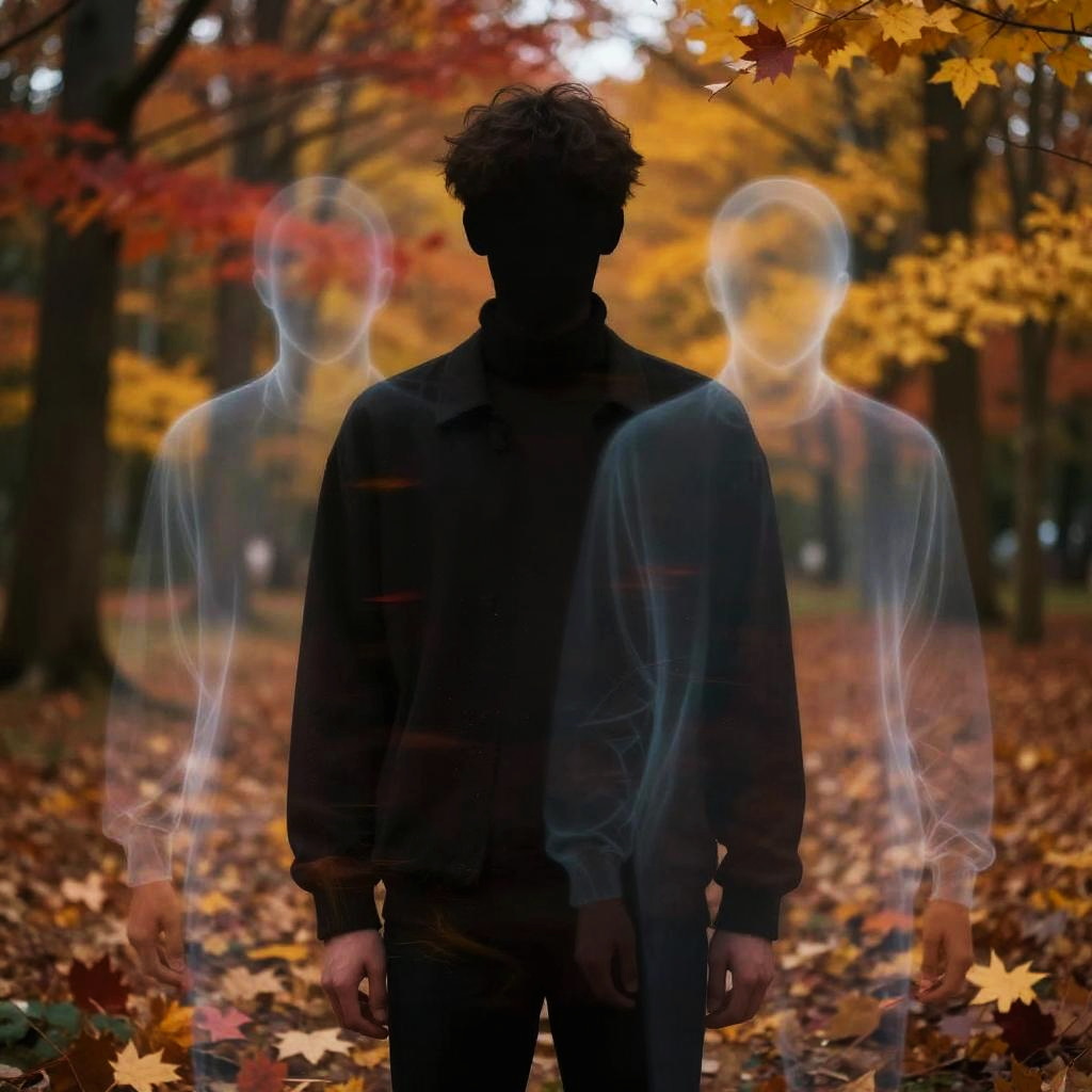 Male form, impressionistic blur effect, earthy warm colors, burnt orange and sienna dominant tones, modern surrealism style, contemporary blend exposures, ghost trails, mirrored visuals