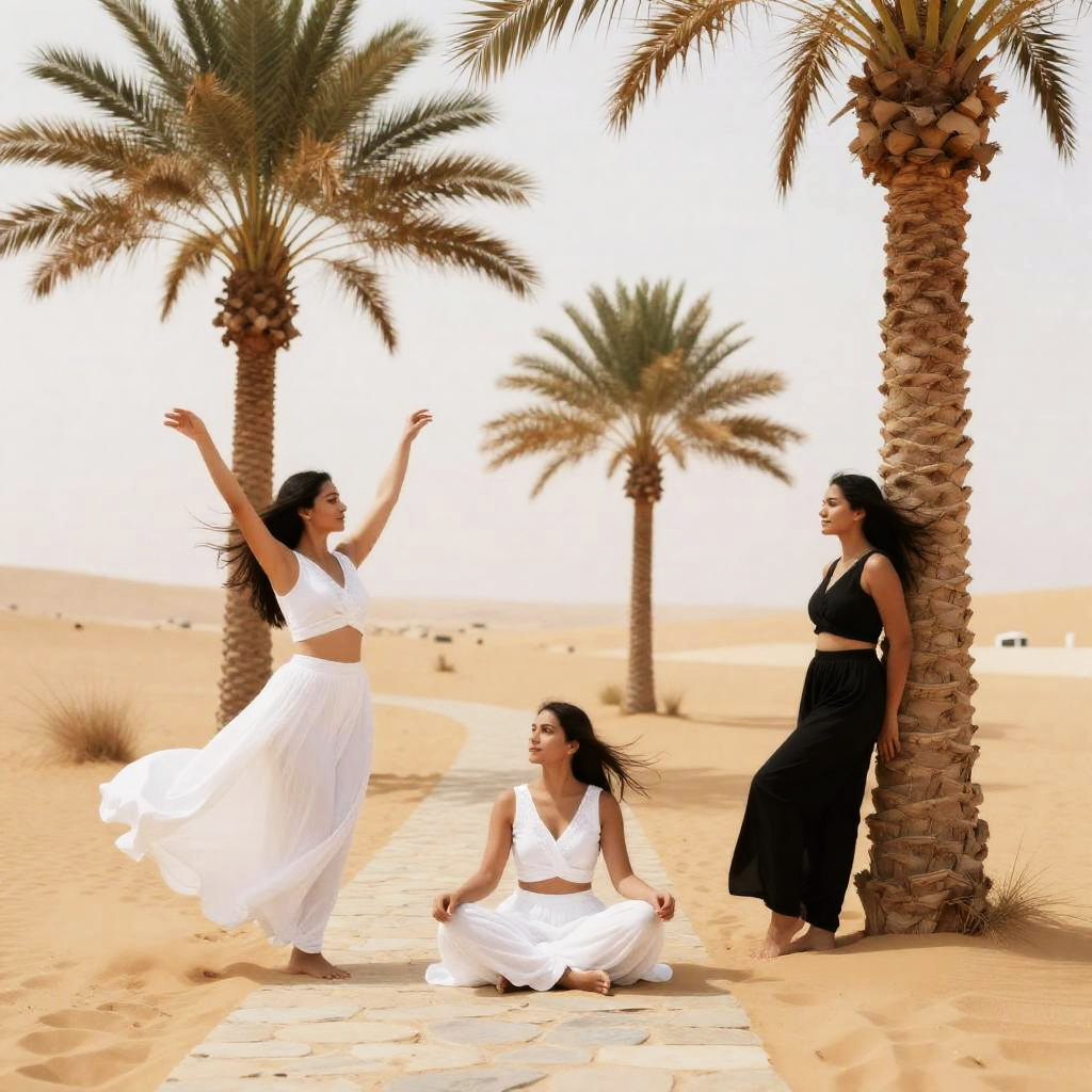 Photograph of three people in a desert-like setting with palm trees. Two women in white outfits; one dancing with arms raised, one sitting cross-legged. One woman in black clothing, leaning against a palm tree. Sand, stone path, windblown sand.