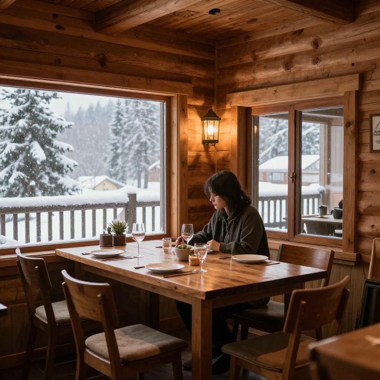 Photograph of a woman with long, dark hair seated at a rustic wooden table in a cozy log cabin dining room. She is wearing a dark jacket and is focused on eating, with a wine glass and plate in front of her. The room has wooden walls, a large window showing a snowy outdoor scene with evergreen trees, and a lit lantern on the wall. The table has a small potted plant and additional plates. The chairs are simple wooden with cushioned seats. The atmosphere is warm and inviting, contrasting with the cold winter outside.