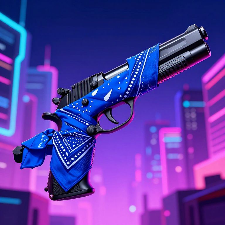 Stylized blue bandana wrapped around modern gun, neon cityscape in background, cyberpunk vibe, vibrant colors, sharp focus, dynamic and edgy art style