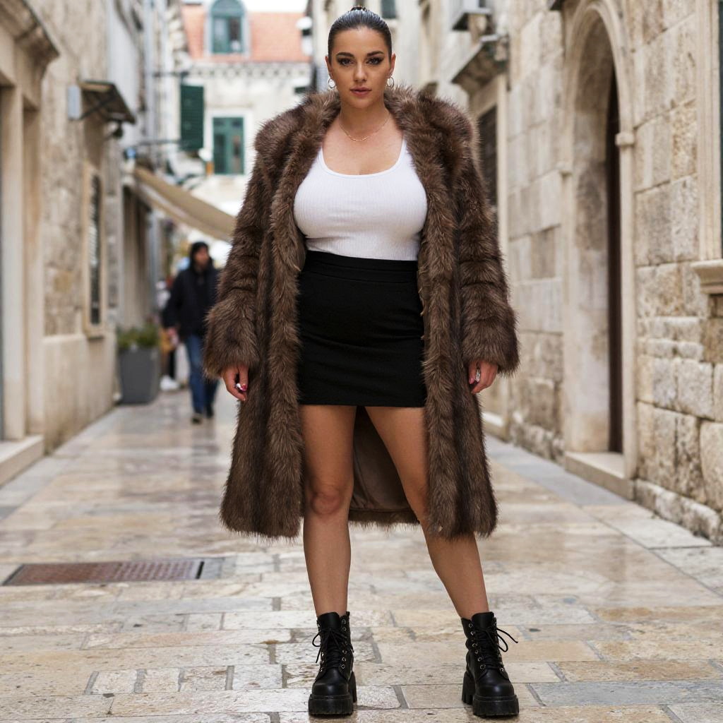 A woman, styled in the visual aesthetic of Pedro Campos, wearing an oversized brown faux fur coat over a ribbed white tank top and a high-waisted black mini skirt, chunky black lace-up boots, and minimalistic silver hoop earrings, standing in a historic street in Dubrovnik with city walls. Sexy. Pretty face and beаutiful eyes. Big breasts
