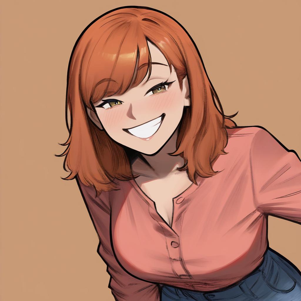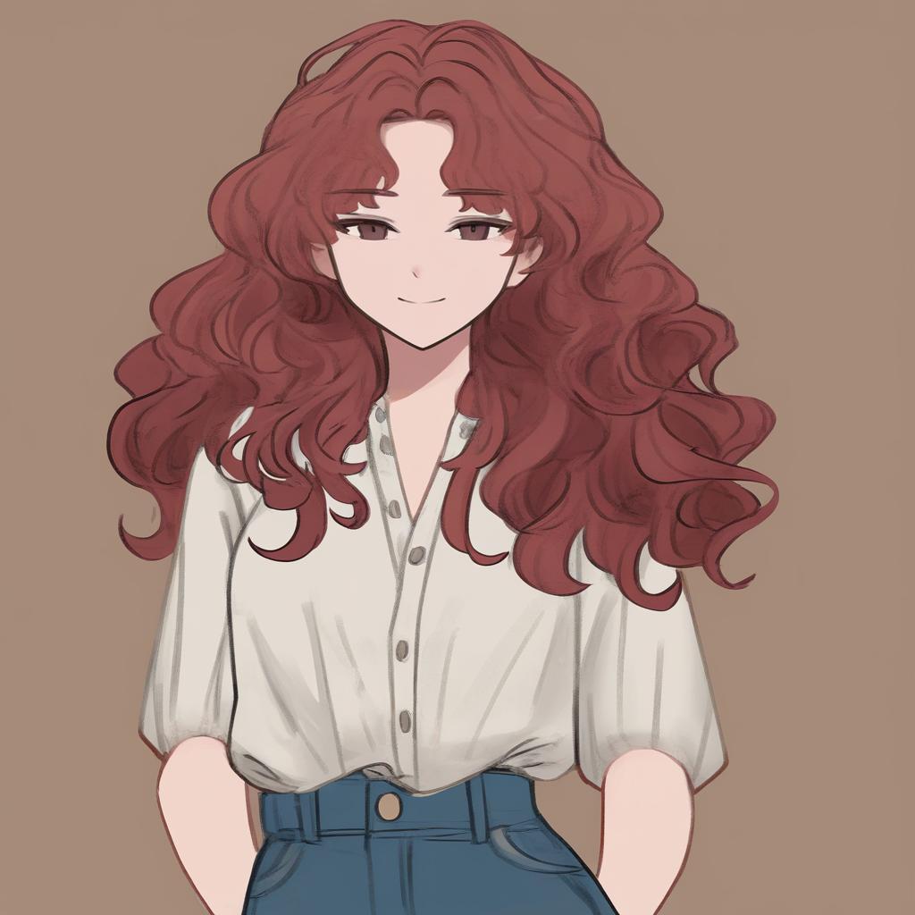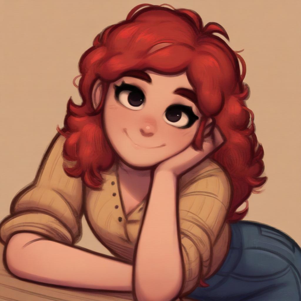 Upper body, 1girl, solo, cheerful teenage girl with curly blonde hair and bright green eyes, button-up blouse, denim jeans, relaxed posture, seated positioning, resting her chin on her hand, warm smile, brown background