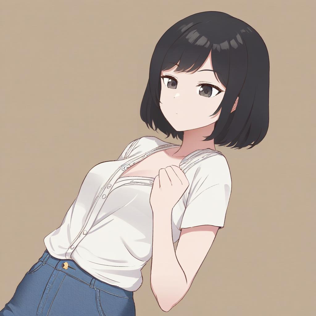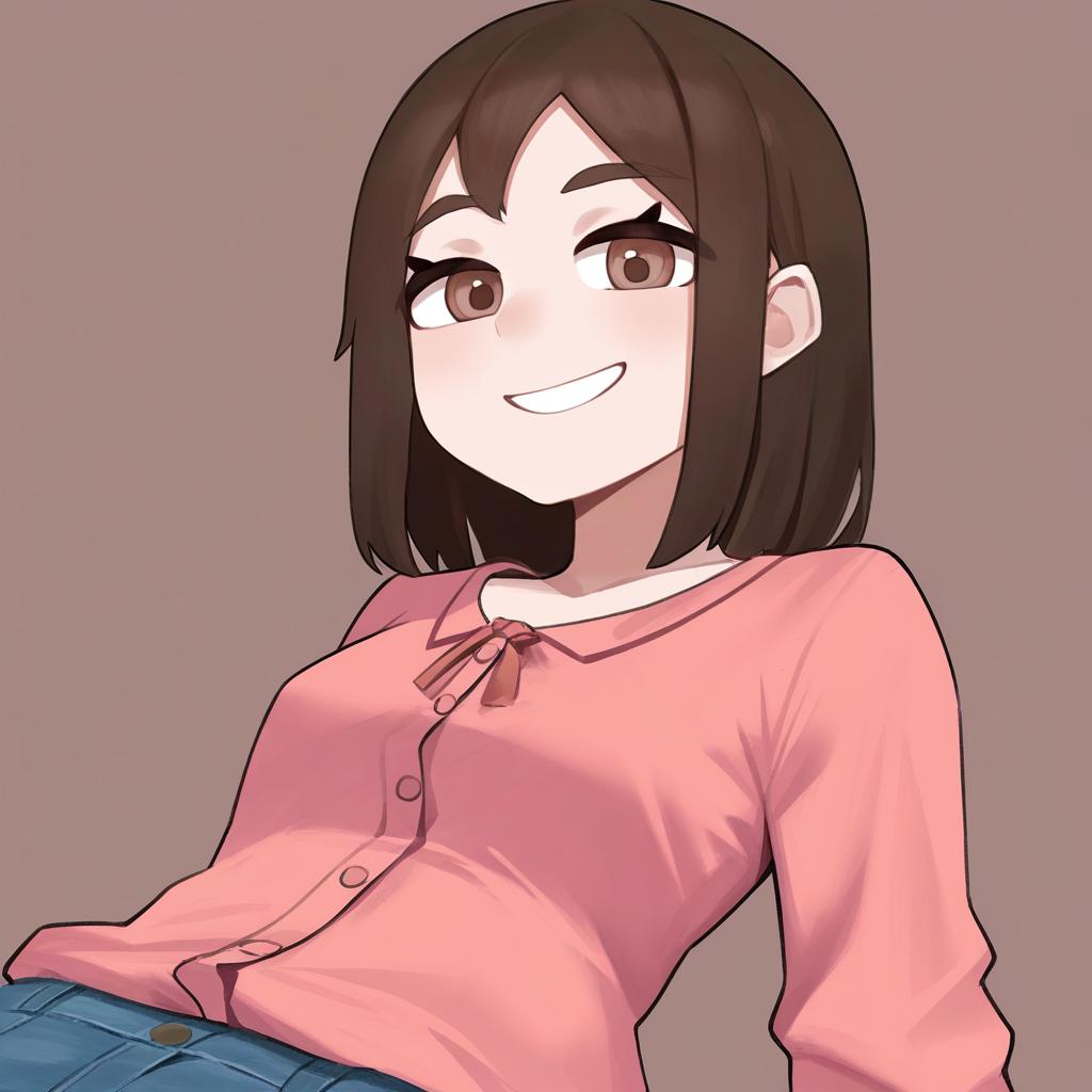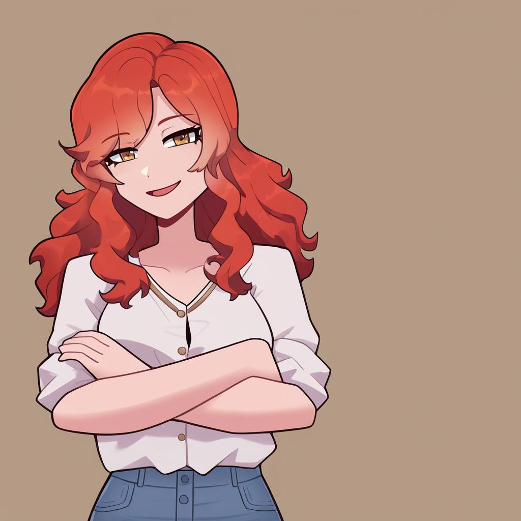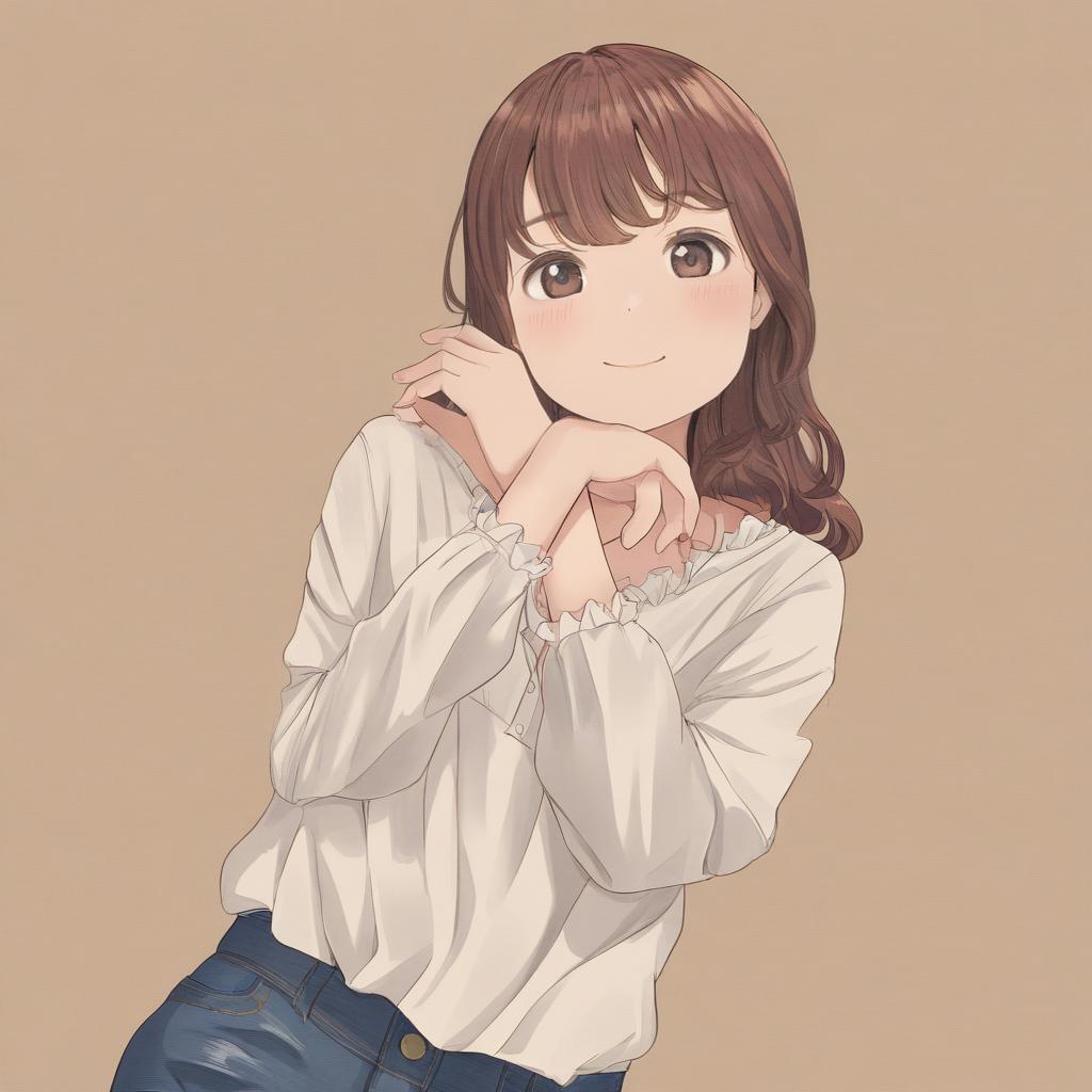 Upper body, 1girl, solo, cheerful teenage girl with curly blonde hair and bright green eyes, button-up blouse, denim jeans, relaxed posture, seated positioning, resting her chin on her hand, warm smile, brown background