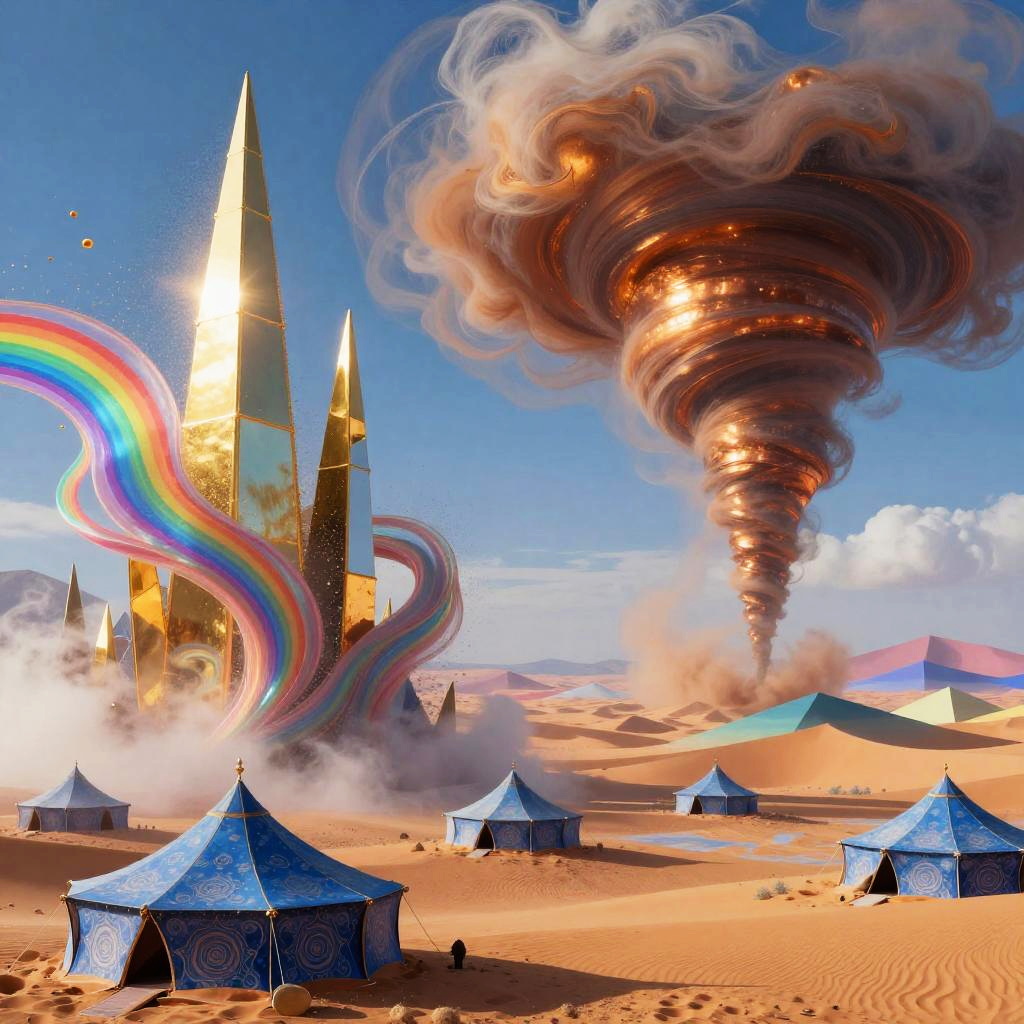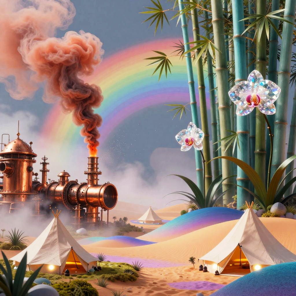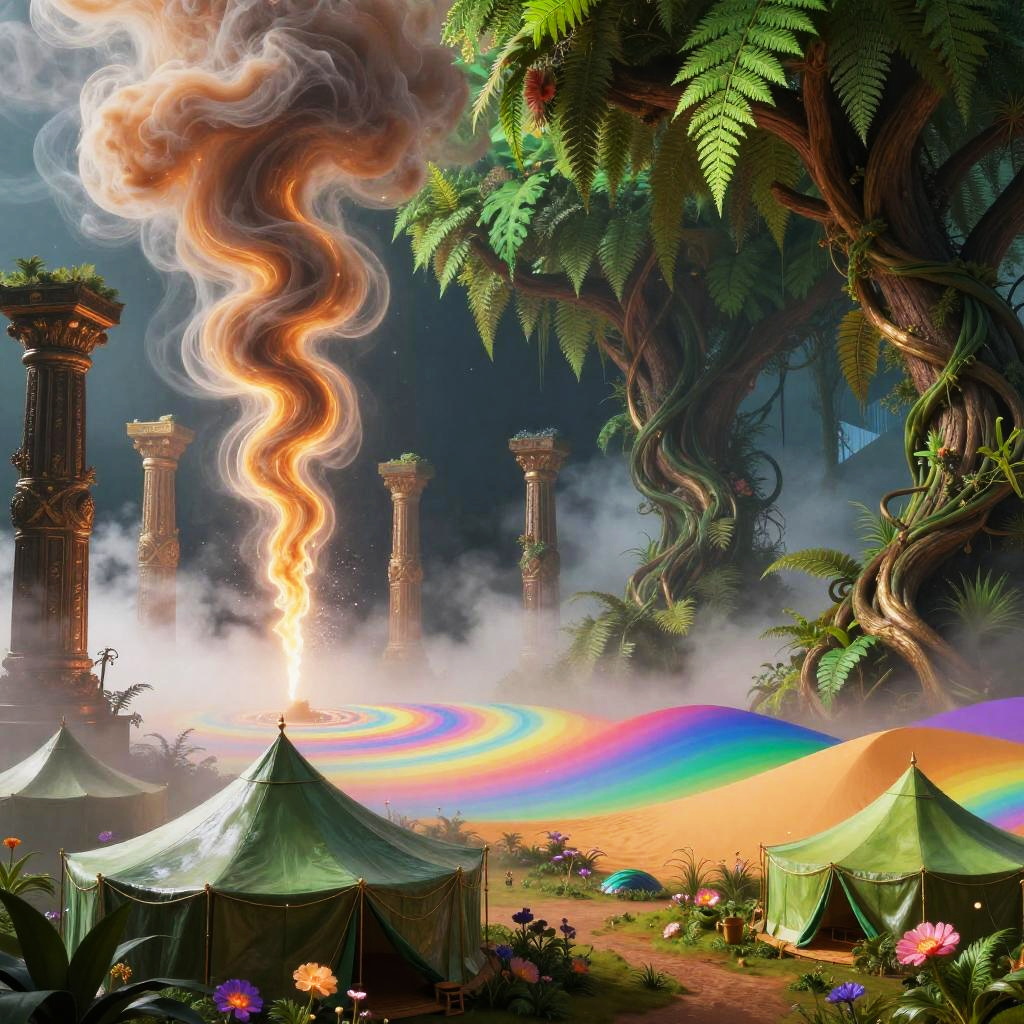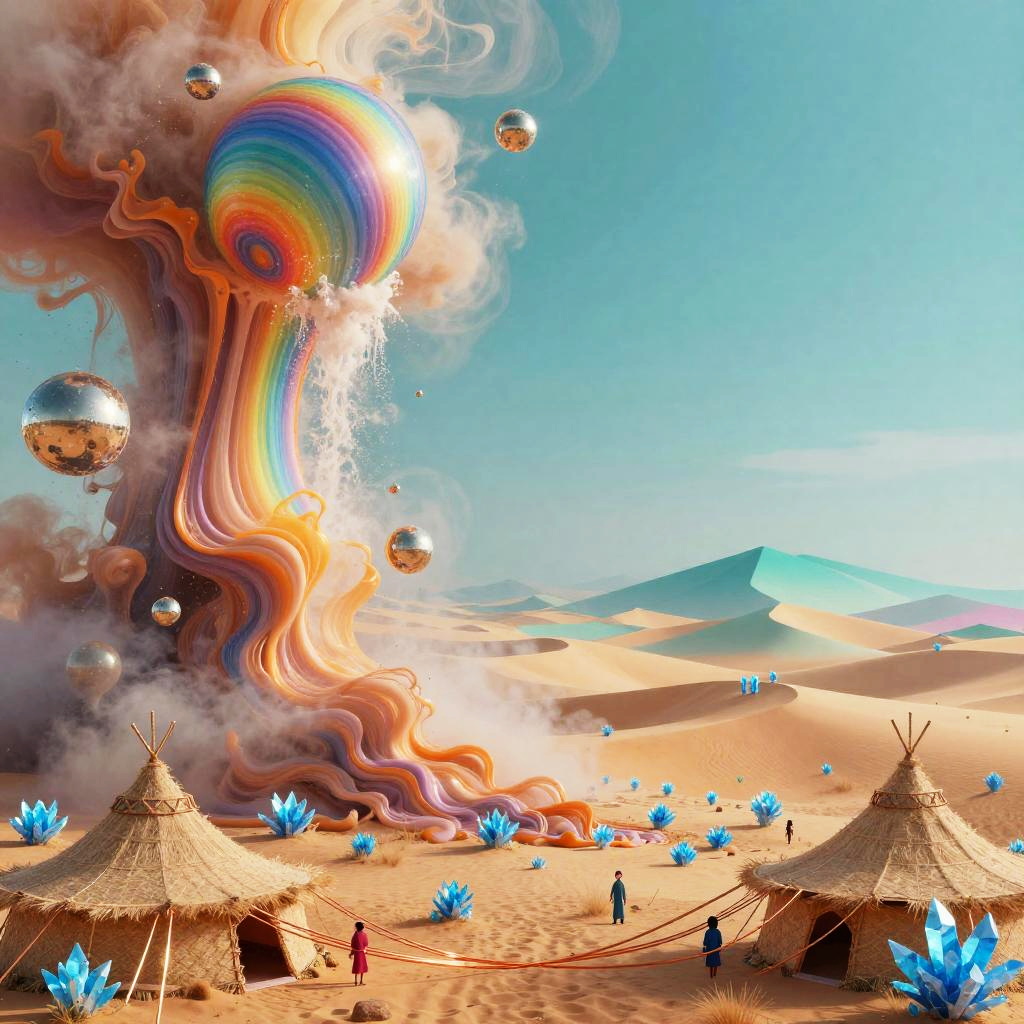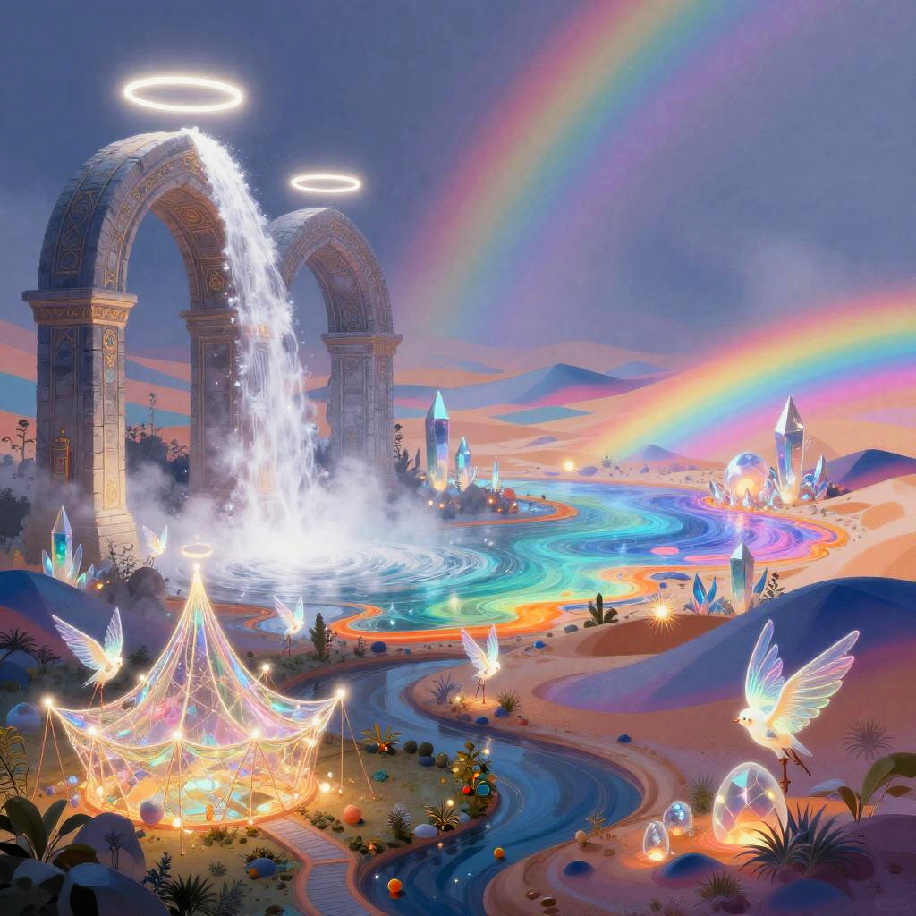 A surreal dreamscape digital artwork depicting a vibrant, abstract scene. On the left, silvery moonlight waterfall draping over ancient black stone ruins shimmers through mist, sending spray into swirling rainbow patterns. On the right, lavender mist-covered hills dotted with floating amethyst crystals gradually blends into prismatic dunes and geometric hills. In the foreground, delicate helix-shaped tents colored in pastel mauve scattered along the valley floor add scale and whimsy. High saturation, soft bloom, glowing gradients, painterly detail, floating particles, cinematic wide shot, intricate textures, dreamlike atmosphere.