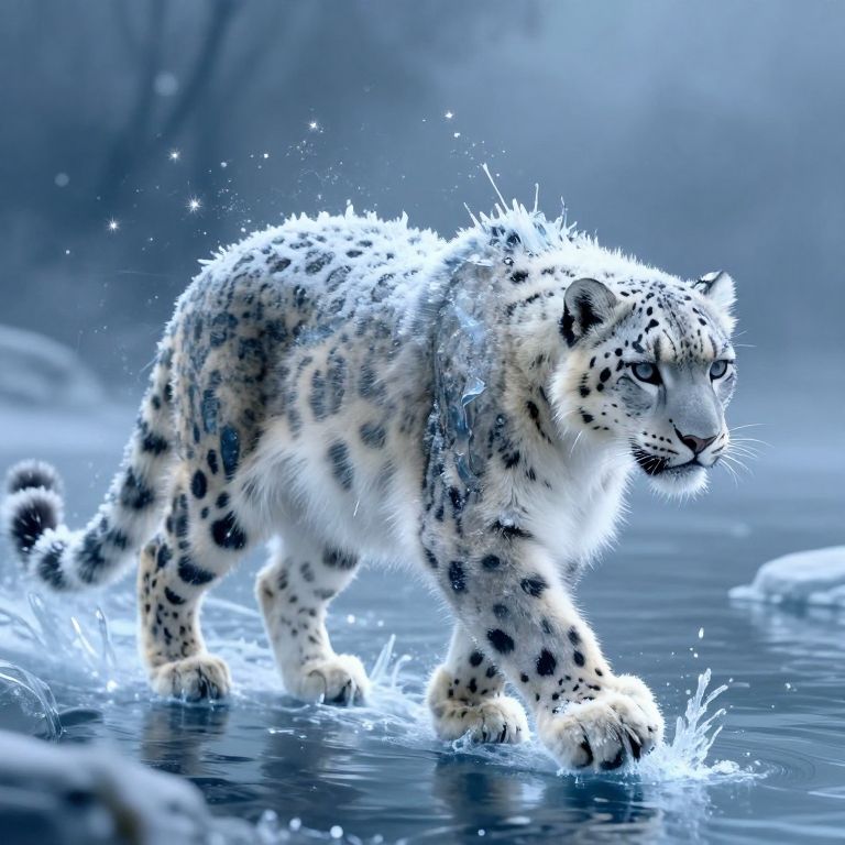 Beautiful aesthetic, a snow leopard made of ice, glass and snow, covered in icicles, walking on water, its steps freezes the water, magical aura, fantasy art, peaceful, high fantasy style, mysterious, celestial light, ethereal, painterly, epic, majestic, magical, fantasy art, cover art, sparkling ice, dramatic lighting