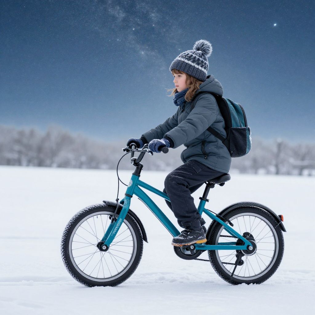 Three children in vibrant orange hoodies race down a snowy street on bicycles with oversized, frost-covered tires, their laughter echoing between colorful apartment buildings that stand tall against a backdrop of fluffy white clouds.