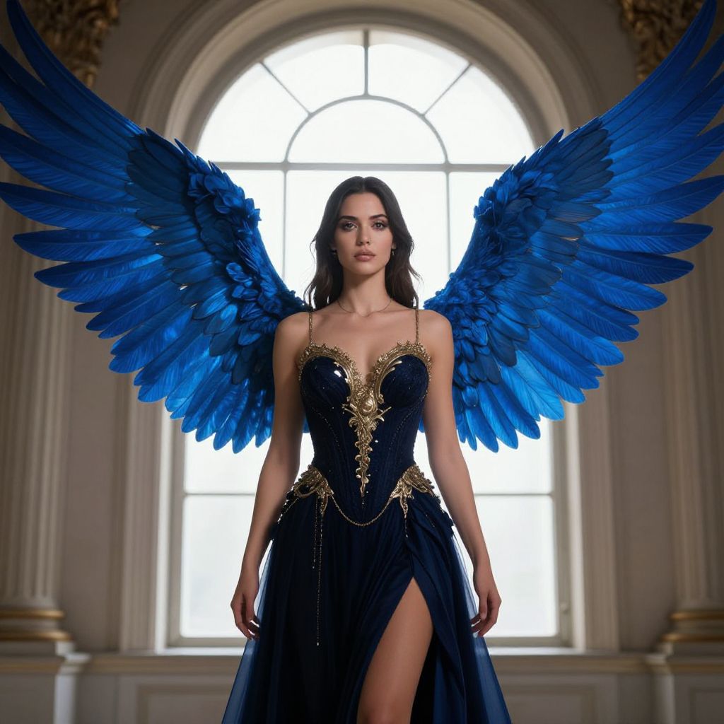A striking fantasy portrait of a woman with large, vibrant blue wings standing in front of an ornate arched window. Her dark, elegant dress features intricate gold detailing, complementing her ethereal and powerful presence in this detailed digital artwork.