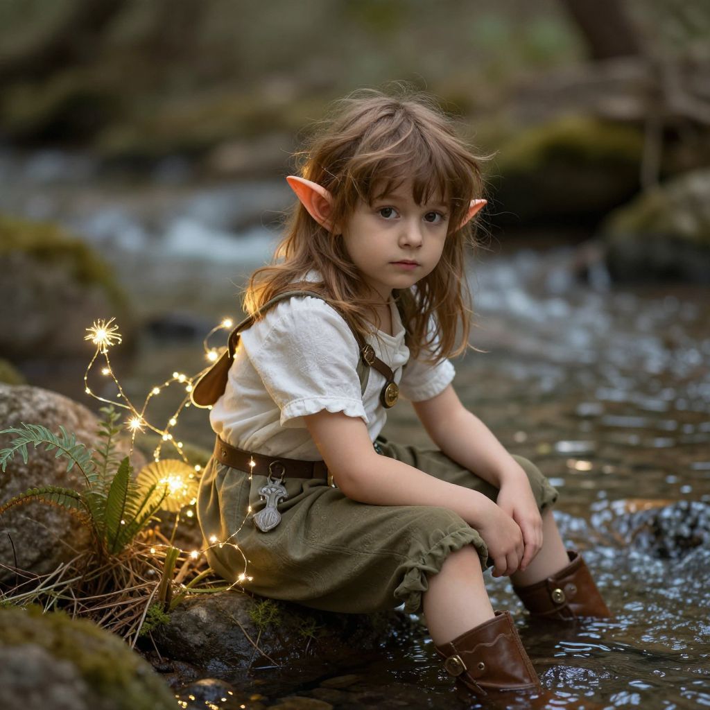 Photograph of a young girl with elf ears, wearing a white shirt, green shorts, and brown boots, sitting by a stream with fairy lights,