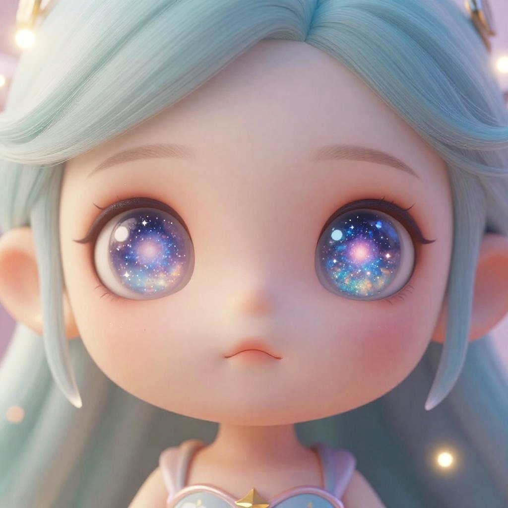 Close-up portrait of a fantasy character with big ass eyes, shimmering with stars and galaxies inside, surrounded by soft glowing light and ethereal pastel colors.