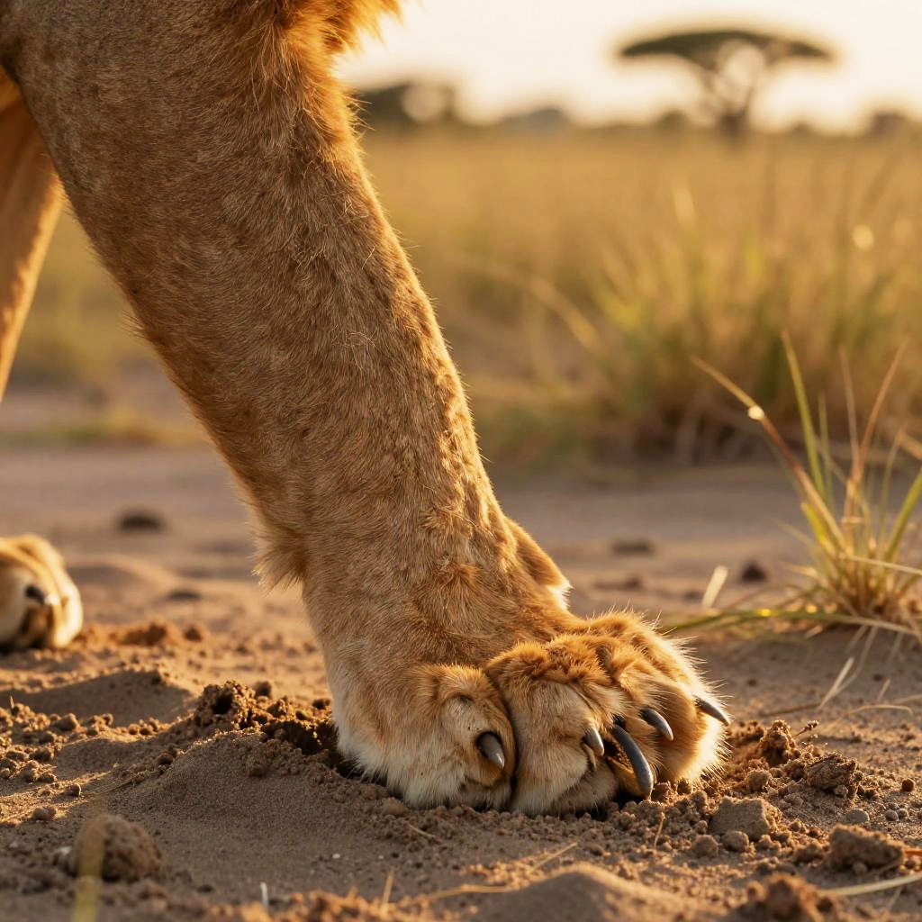 Detailed lion toes pressed into soft sand, wild savannah background with tall grasses, golden lion fur texture glowing in sunset light, macro shot, ultra-detailed