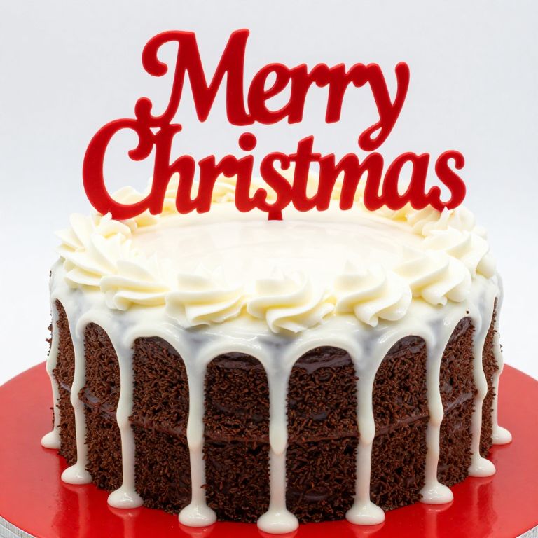 Glistening white frosting cascades over a rich chocolate cake, adorned with a bold red topper that reads \"Merry Christmas,\" set atop a vibrant red base.