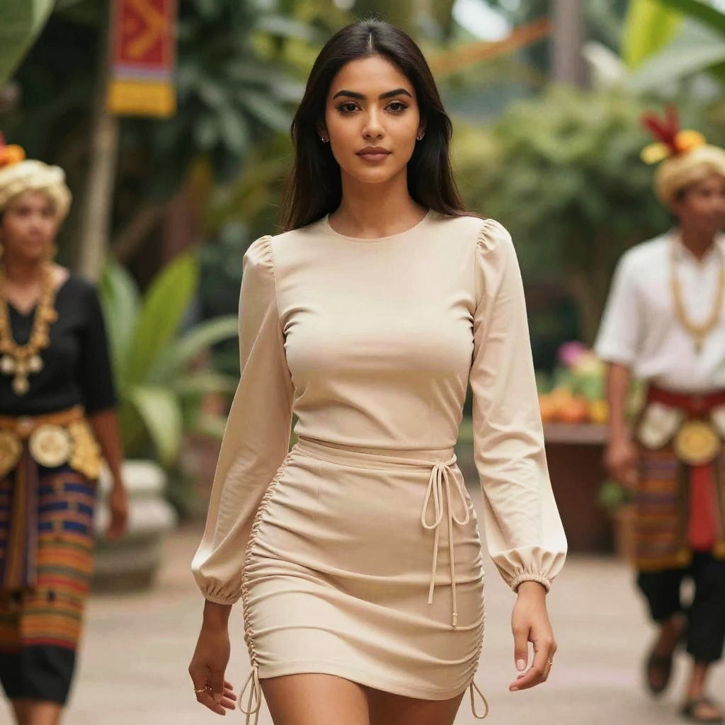 A woman in contemporary streetwear, wearing a beige fitted mini dress with ruched sides and adjustable drawstring ties, high round neckline, and long puffed sleeves, minimal makeup, straight long hair, standing in a lush botanical garden during a cultural celebration, illustrated in the style of IDW Publishing. Sexy. Pretty face and beutiful eyes